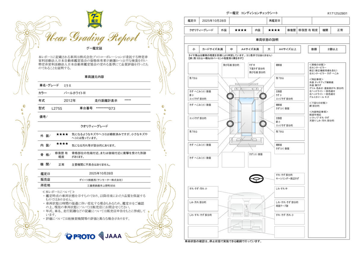 車輌販売価格を上限として、保証期間内に不具合が現れ欠陥が認められた場合は、当該部品の部品及び取替を当社工場で修理いたします。 |