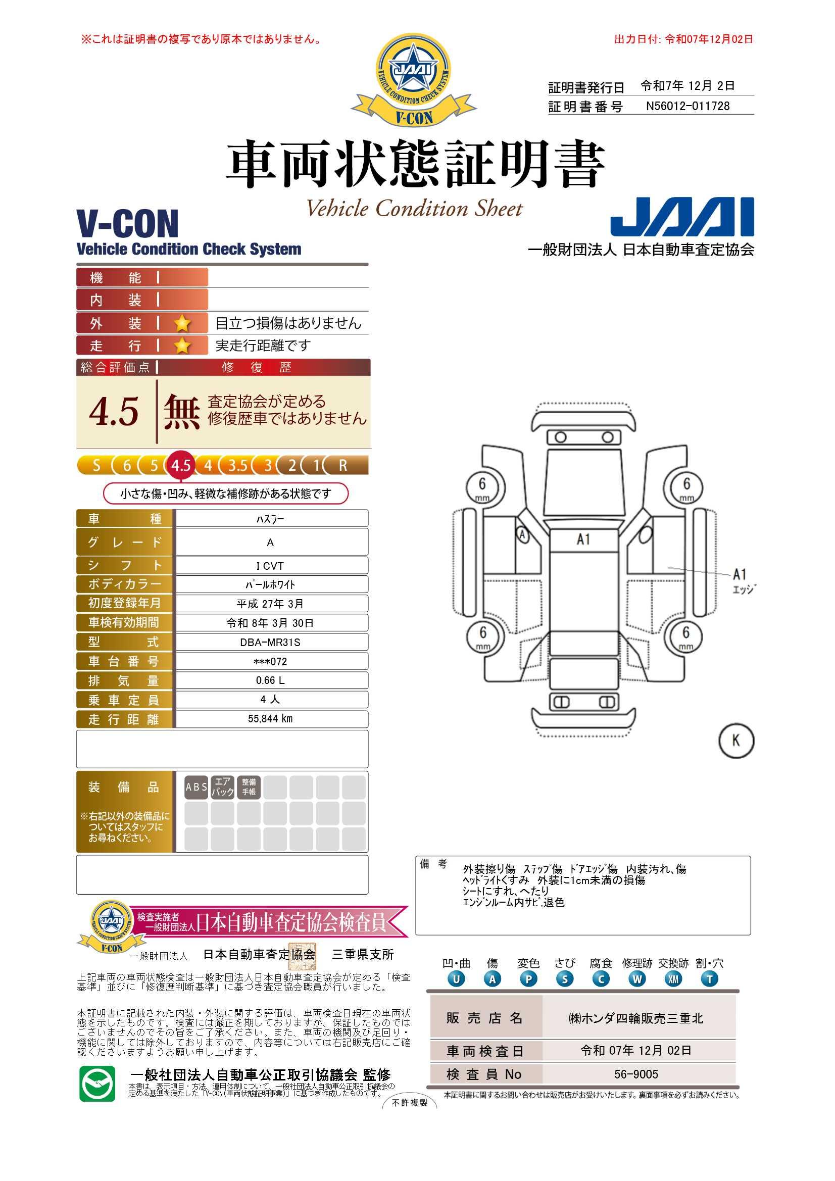 【JAAI 第三者機関の鑑定】→販売する1台1台の車輛をプロの査定士にチェックしてもらい、修復歴また走行メーター不備がないか確認してもらってるから、安心してお車をお選びいただけます!チェック結果の『車両状態評価書』についてはメールお問い合わせ・または店頭にてご確認いただけます。