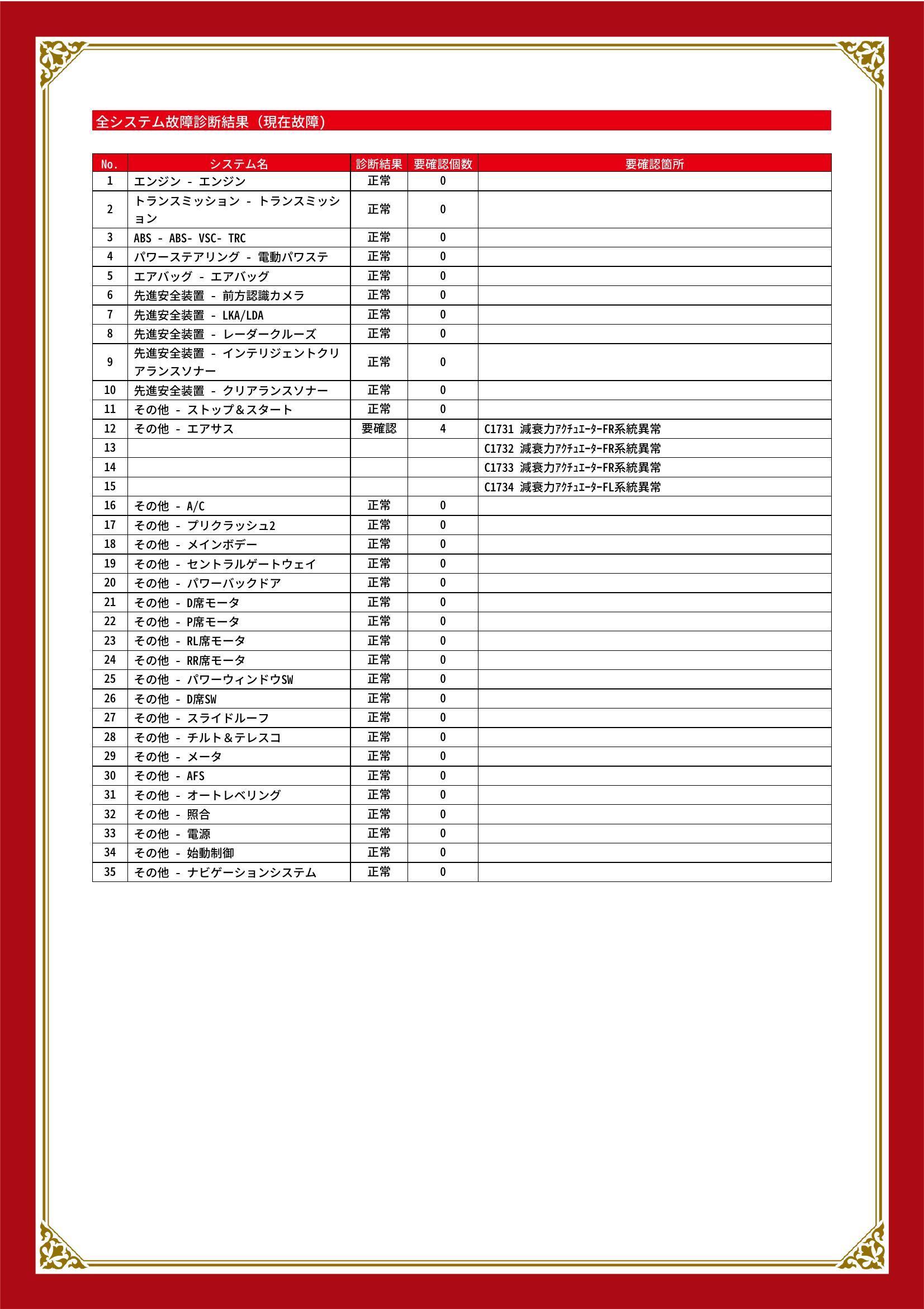 整備付 通常の法定点検に加え/各機関、装備品、電装品、エアコン等の点検整備/コンピューター診断/足回りの分解点検など、車両全体の点検整備を行い必要に応じた部品交換や整備を施し御納車致します。 |