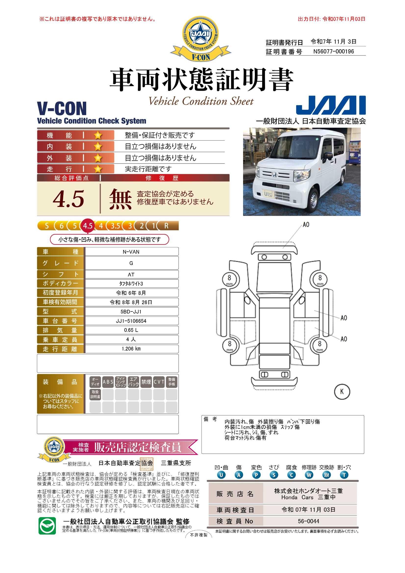ホンダ N−VAN G SENSING オートマチック オートエアコン R6年式 走行1.206km SENSING オートマチック オートエアコン CDデッキ キーレス オートクルーズ 車検R8.9月まで 新車保証付