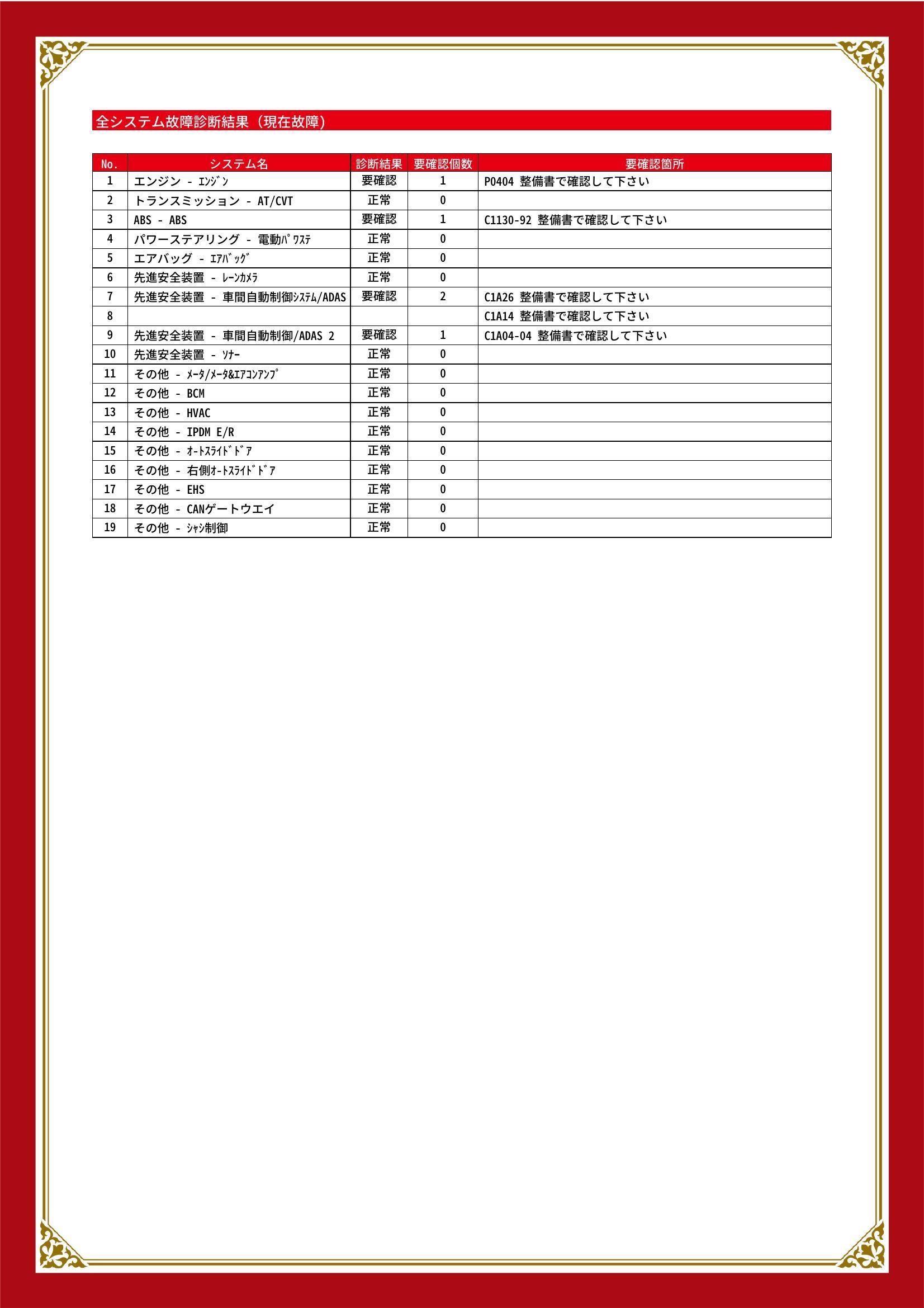 ゼノモーター無料保証について■対象になる項目エンジン主要部分のみ■上限金額上限3万円まで別途380項目プレミア保証のご案内も可能になりますのでスタッフへお問い合わせください。