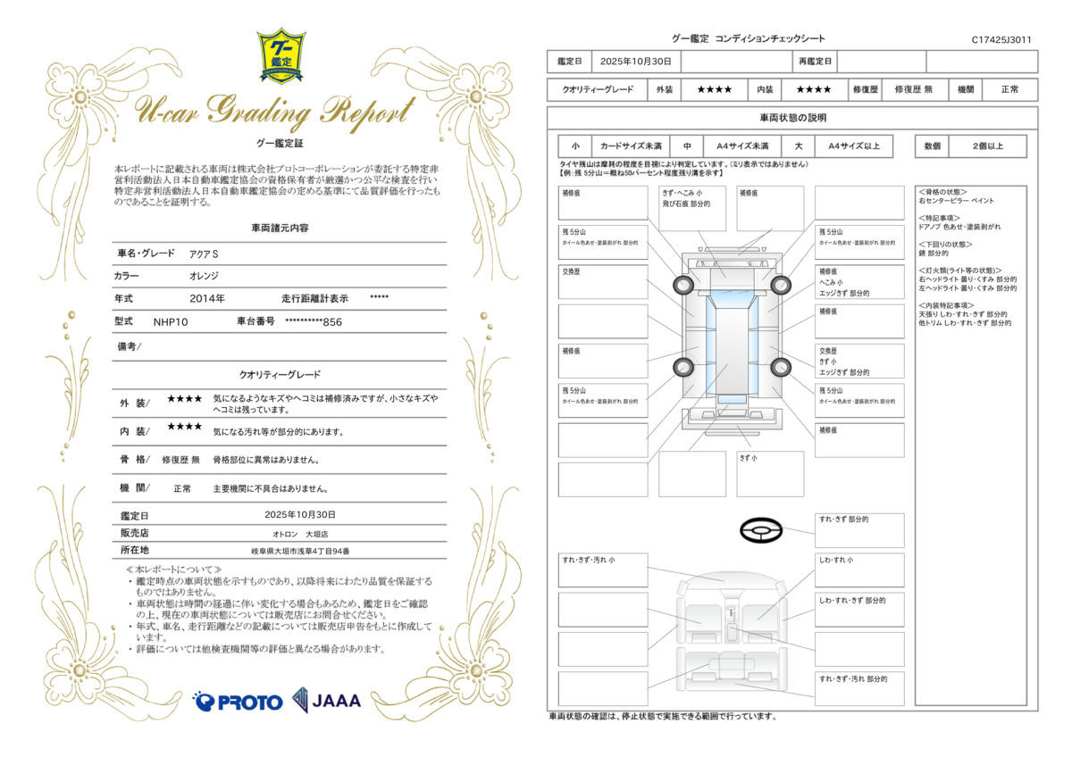 | 保証項目 | 計10項目 エンジン、ギア、トランスミッション、ステアリング機構、サスペンション、ドライブシャフト、デフ、エアコン、発電機、ブレーキ関係※いずれもオイル漏れ、経年劣化を除く。別途適用外事項は納車時にご説明します。 |