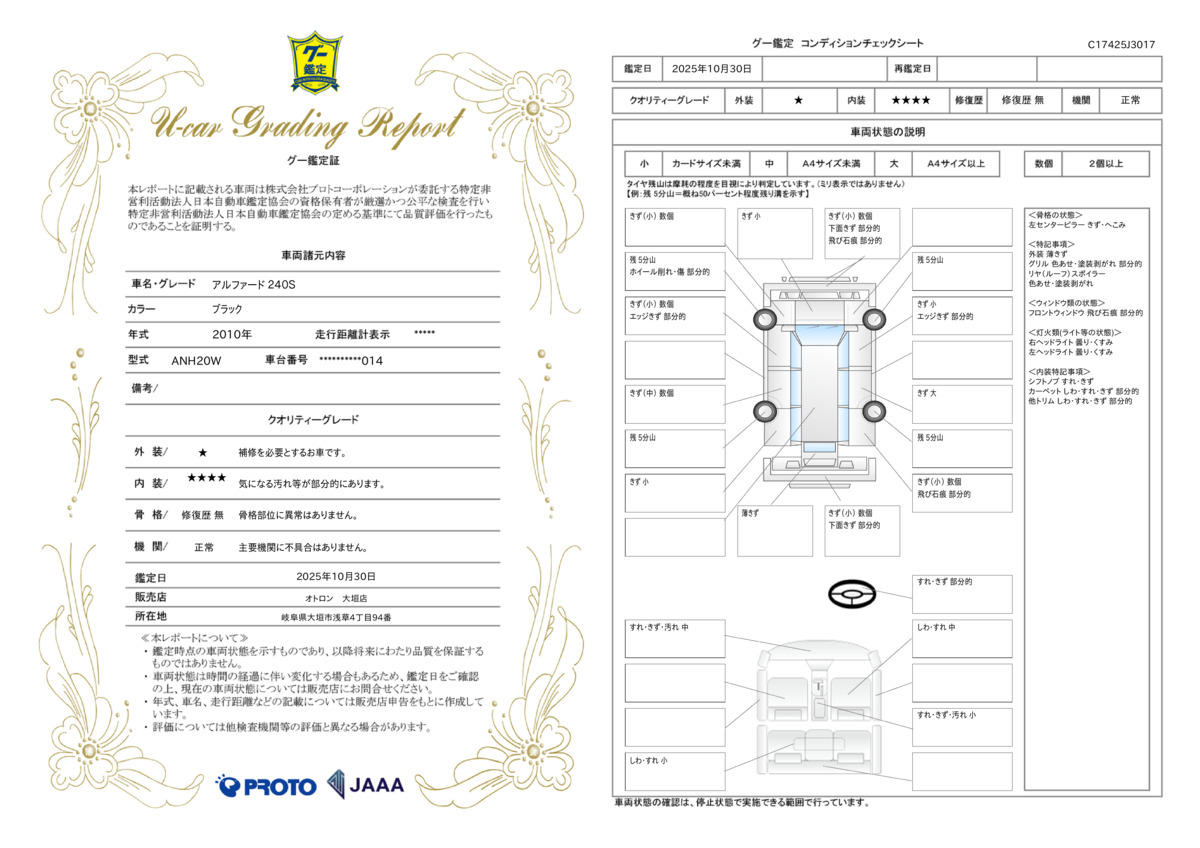 | 保証項目 | 計10項目 エンジン、ギア、トランスミッション、ステアリング機構、サスペンション、ドライブシャフト、デフ、エアコン、発電機、ブレーキ関係※いずれもオイル漏れ、経年劣化を除く。別途適用外事項は納車時にご説明します。 |