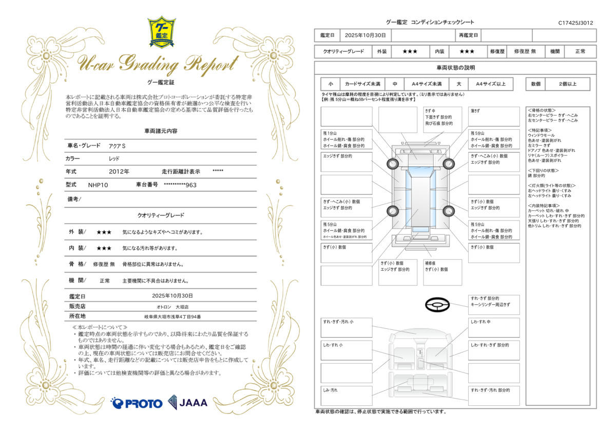 | 保証項目 | 計10項目 エンジン、ギア、トランスミッション、ステアリング機構、サスペンション、ドライブシャフト、デフ、エアコン、発電機、ブレーキ関係※いずれもオイル漏れ、経年劣化を除く。別途適用外事項は納車時にご説明します。 |