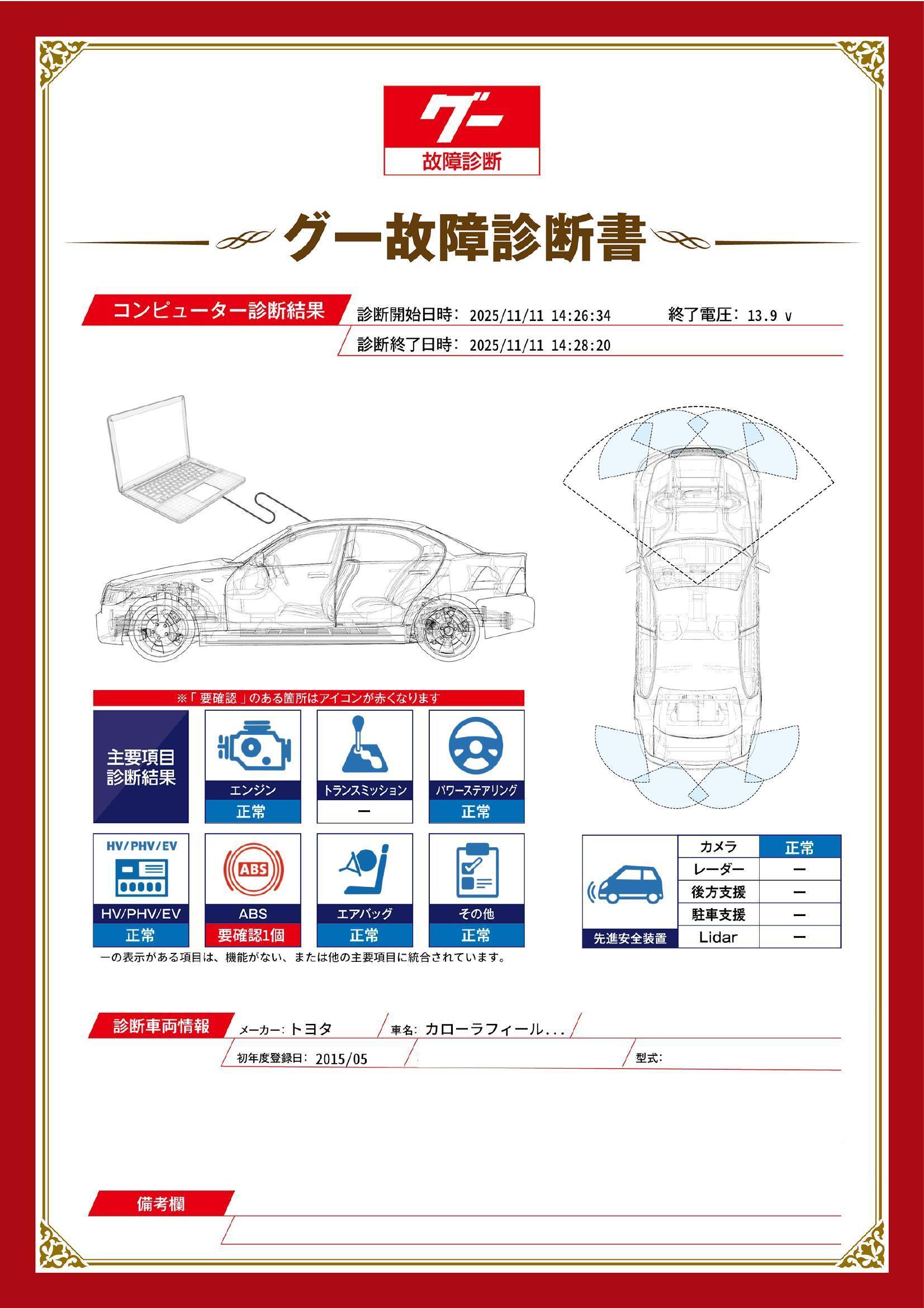計10項目 エンジン・ミッション、ギア、ステアリング、サスペンション、ブレーキ、エアコン、発電機など、消耗品を除く重要箇所に3か月間、3000kmの無料保証有償で期間を1年間、10000KMに延長できます。 |