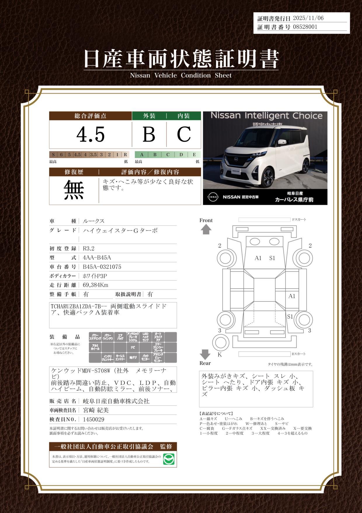 [保証付]:12ヶ月・走行無制限 一年間走行距離無制限保証。純正ディーラーオプション部品も対象。全国約3000ヵ所の日産サービス工場で保証整備が可能です。もちろん新車保証も無料で継承してお渡しします。詳しくは営業部員へ問合せください。 |