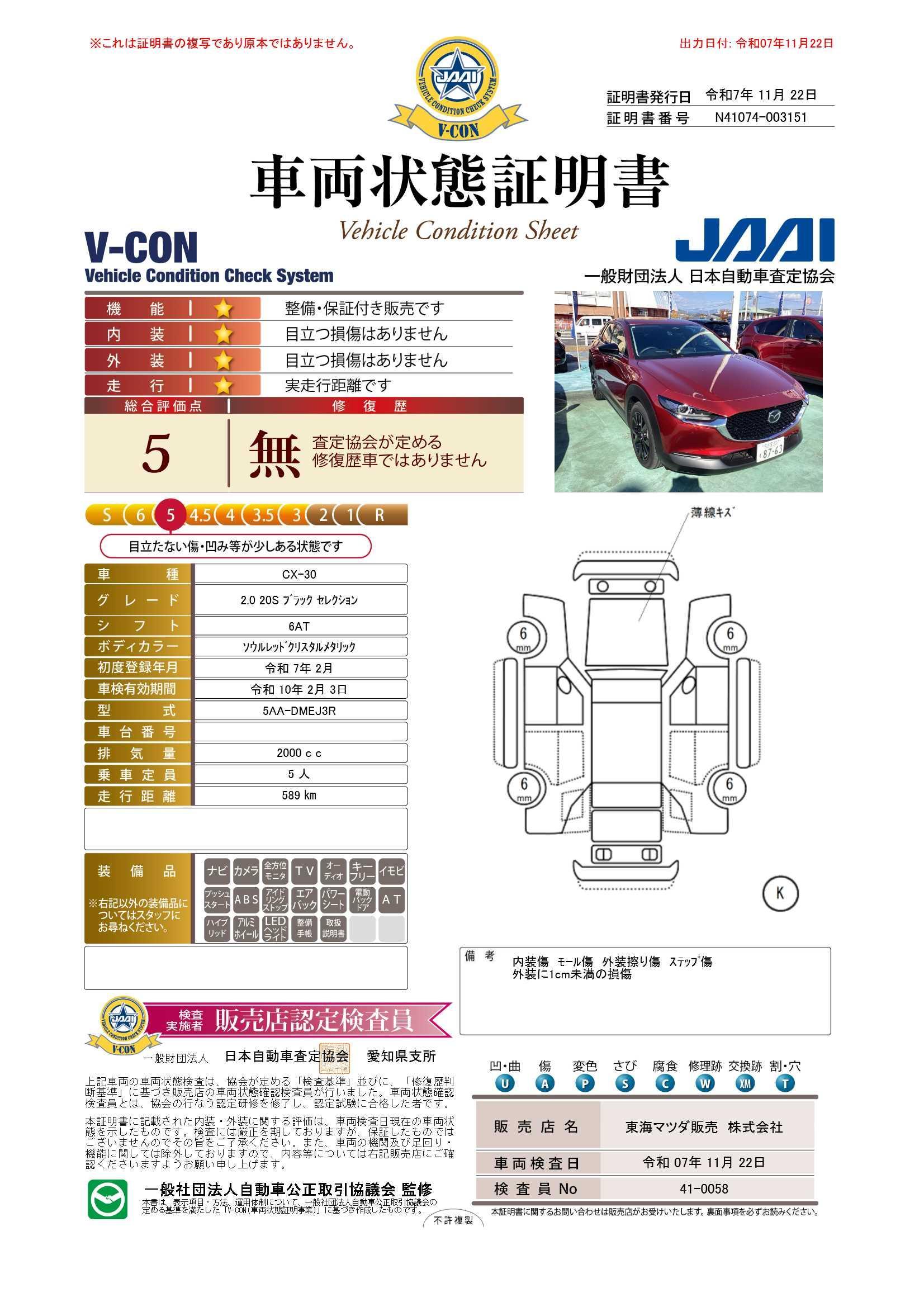 東海マツダの中古車は、全車保証付きで購入後も安心です。