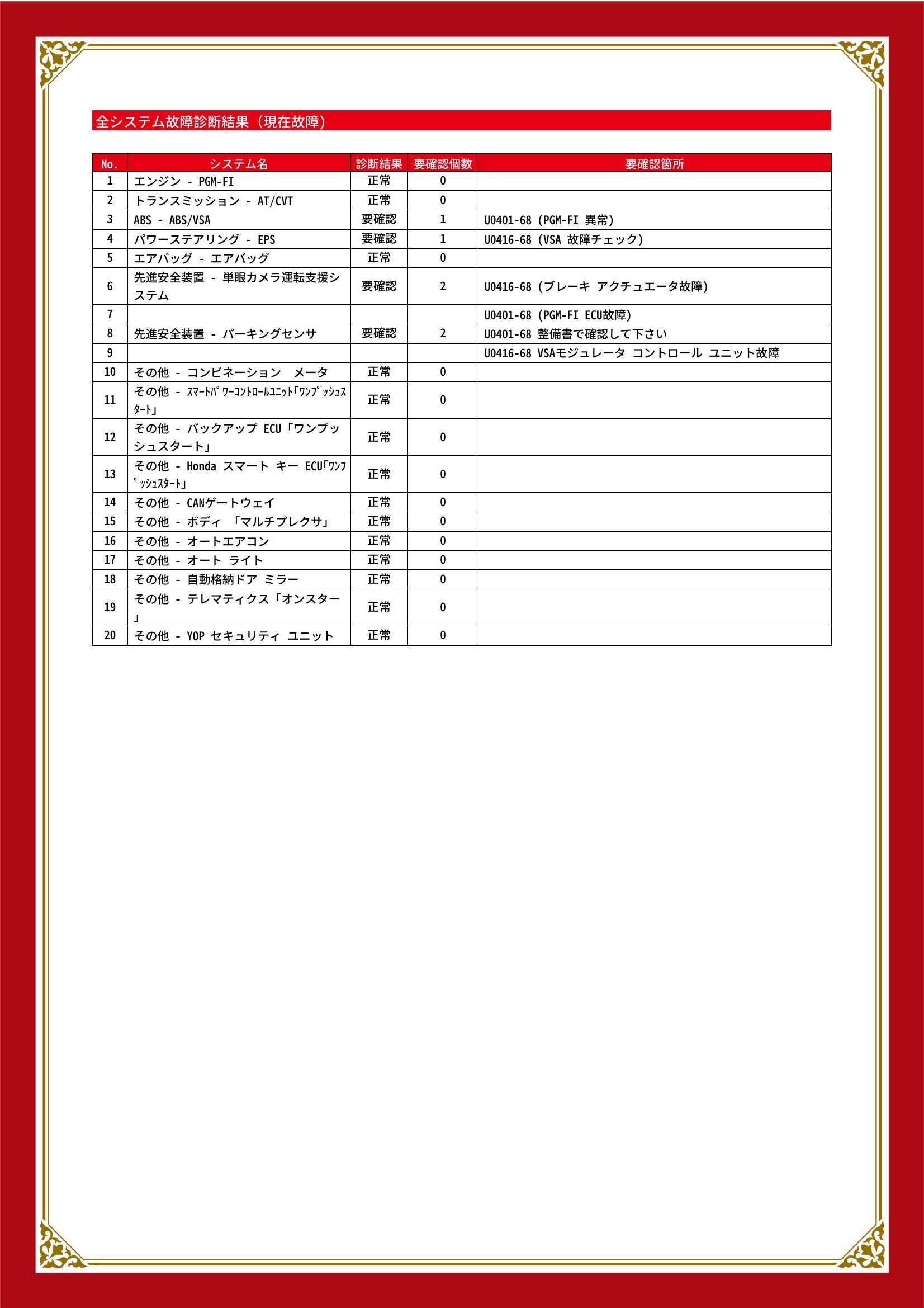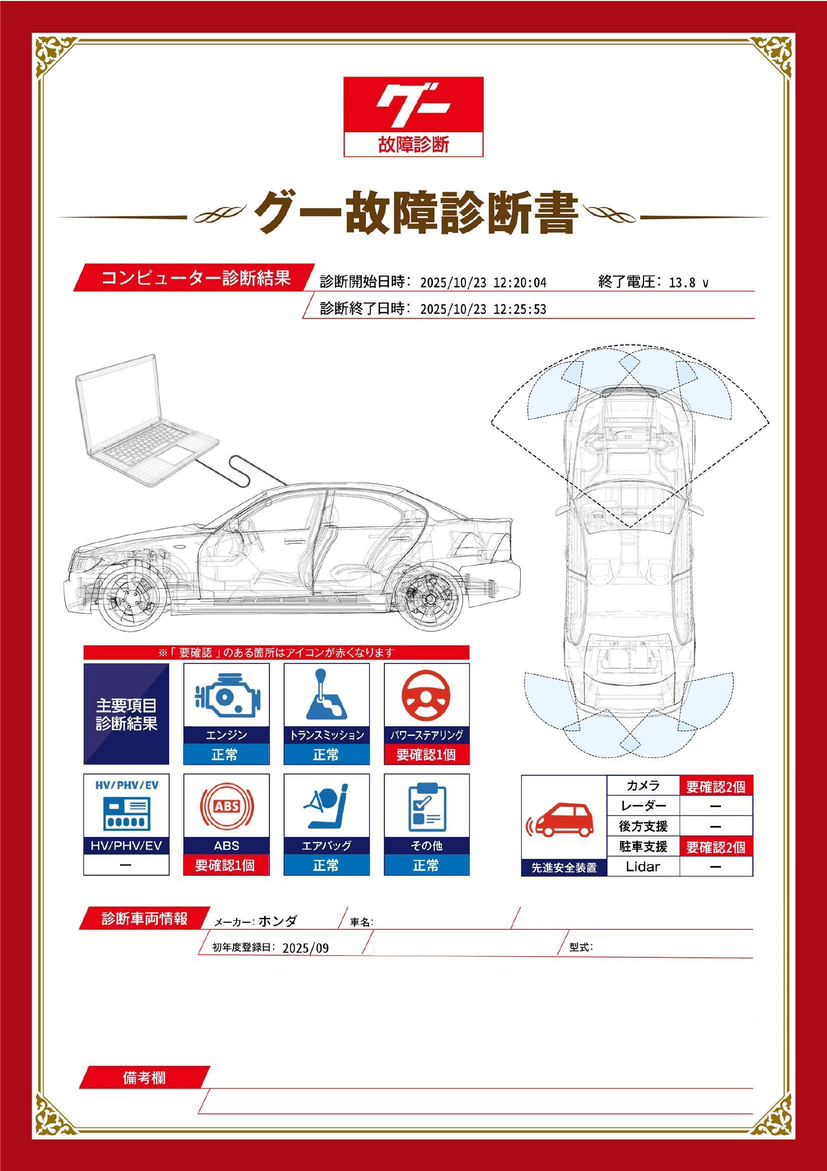 | 保証項目 | 3ヶ月・3000km以内ならエンジン、トランスミッション、ハイブリッド、ステアリング、ブレーキの各機構における主要項目を無償修理(または交換)いたします。 |