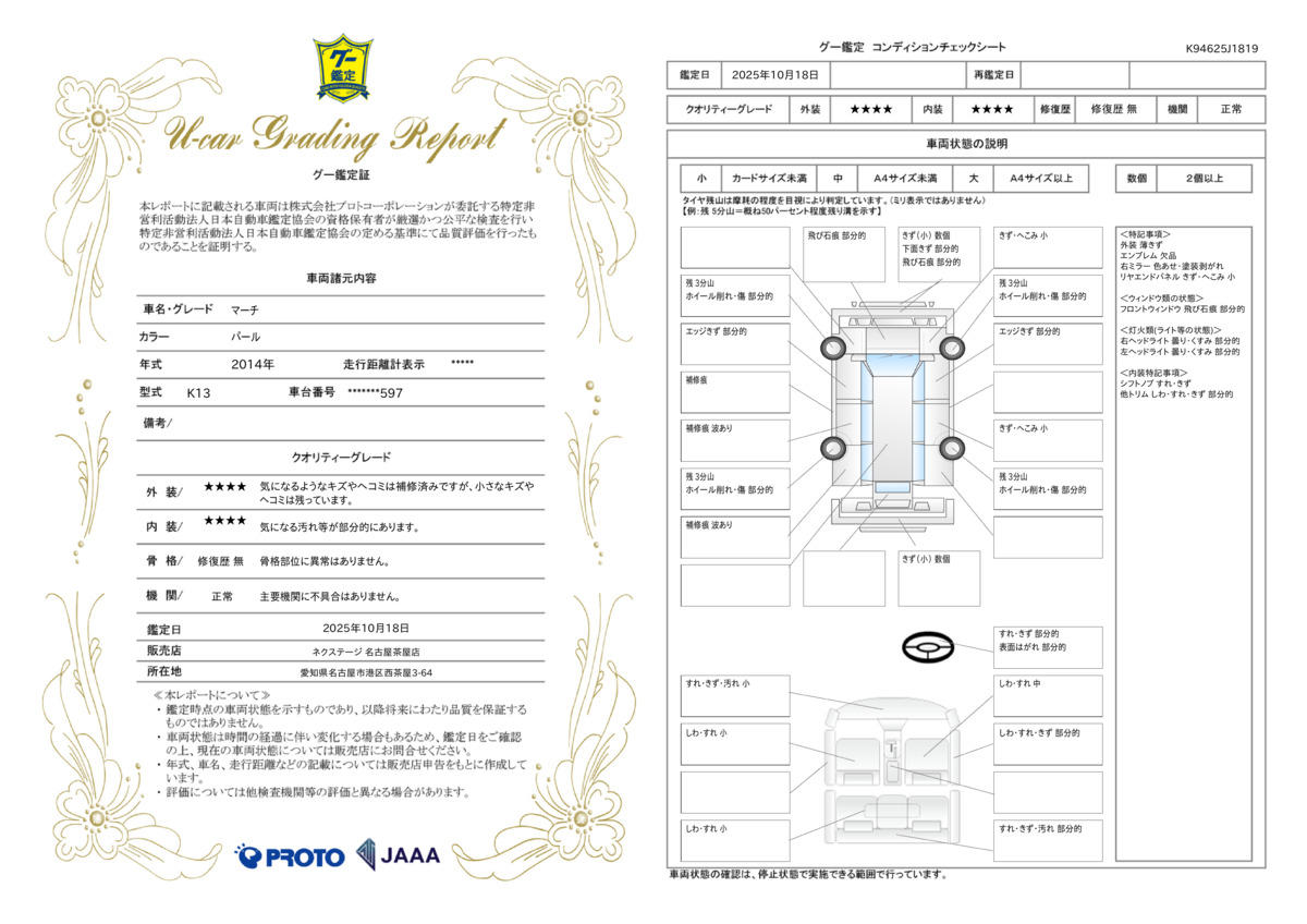 弊社では、全車『修復歴なし』のお車のみ取り扱っております。専任バイヤーによる厳選した仕入れの後、入庫後の車両チェックを行い、ネクステージが認定した高品質な中古車をご提供しております。 15