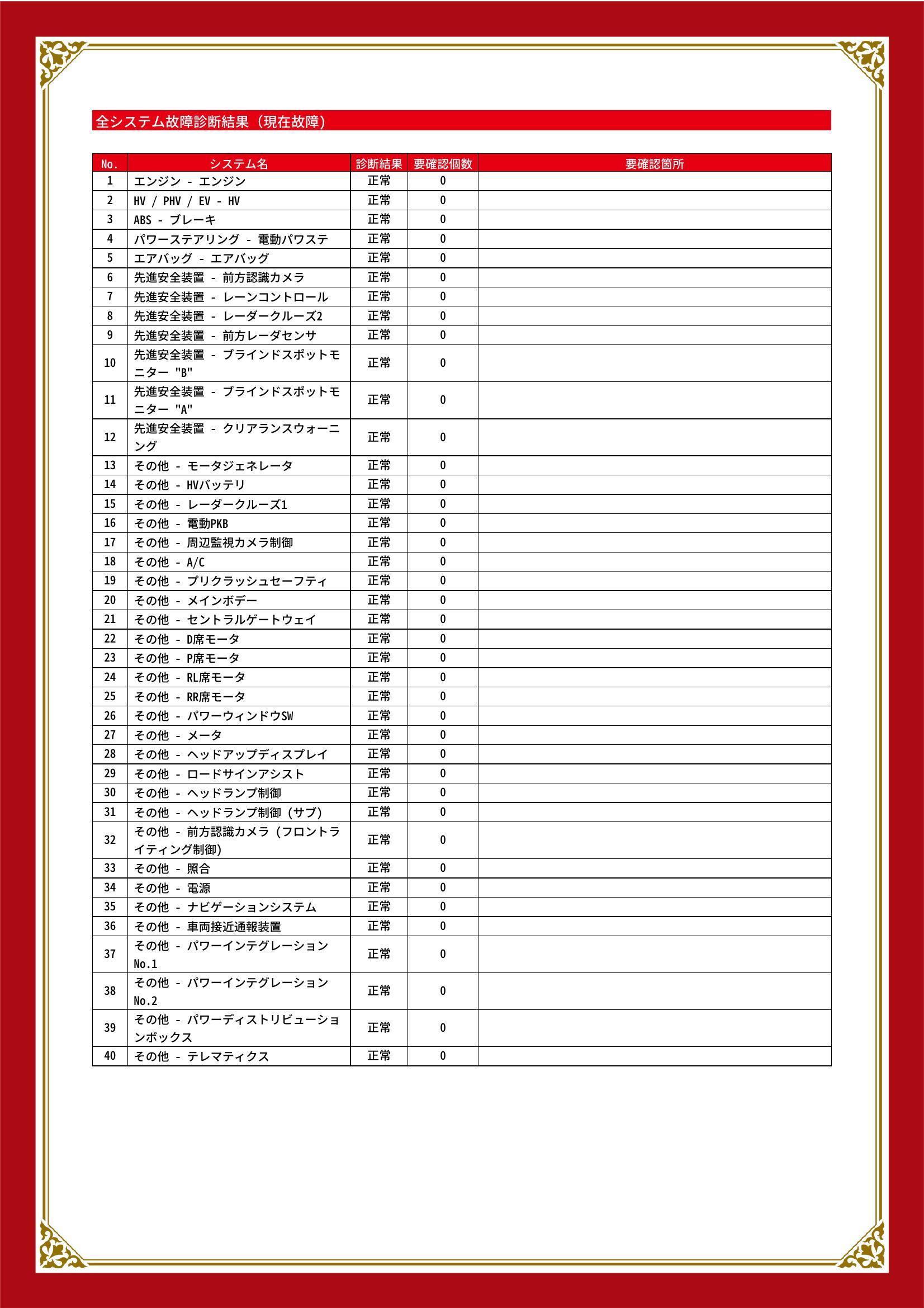 | 保証項目 | 3ヶ月・3000km以内ならエンジン、トランスミッション、ハイブリッド、ステアリング、ブレーキの各機構における主要項目を無償修理(または交換)いたします。 |