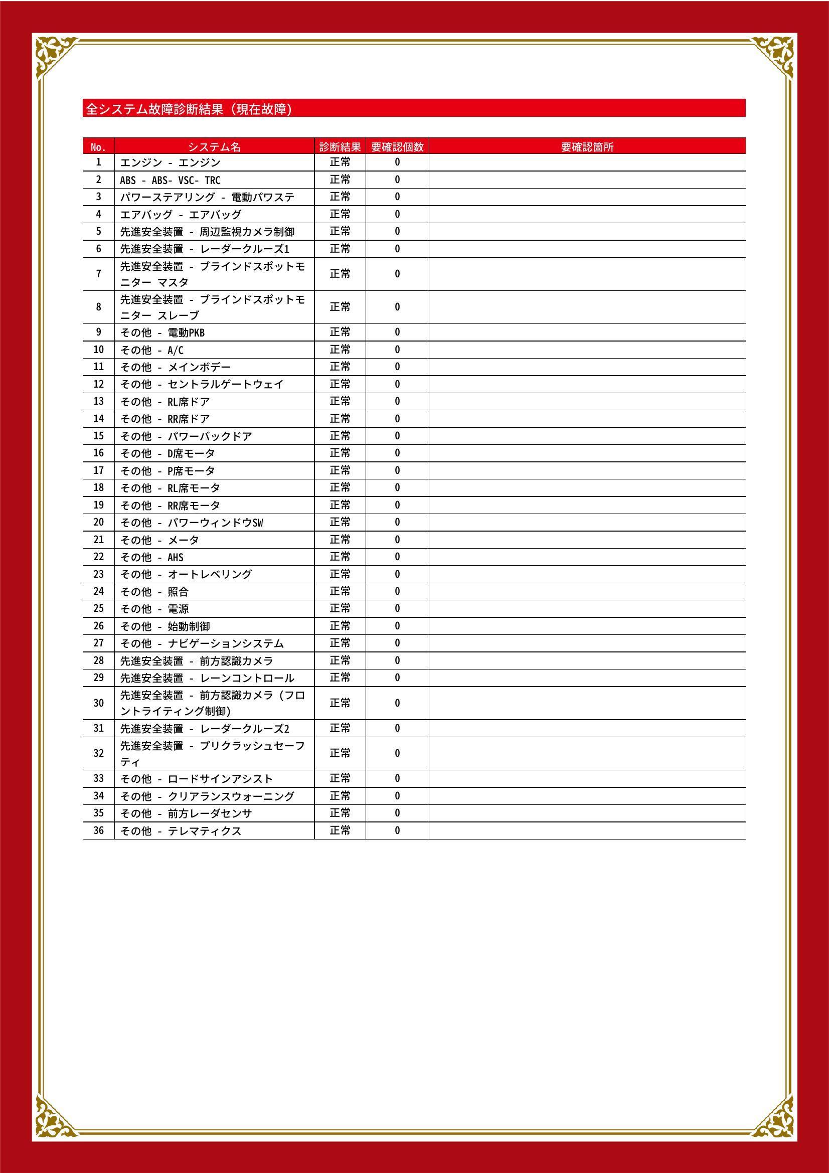 | 保証項目 | 3ヶ月・3000km以内ならエンジン、トランスミッション、ハイブリッド、ステアリング、ブレーキの各機構における主要項目を無償修理(または交換)いたします。 |