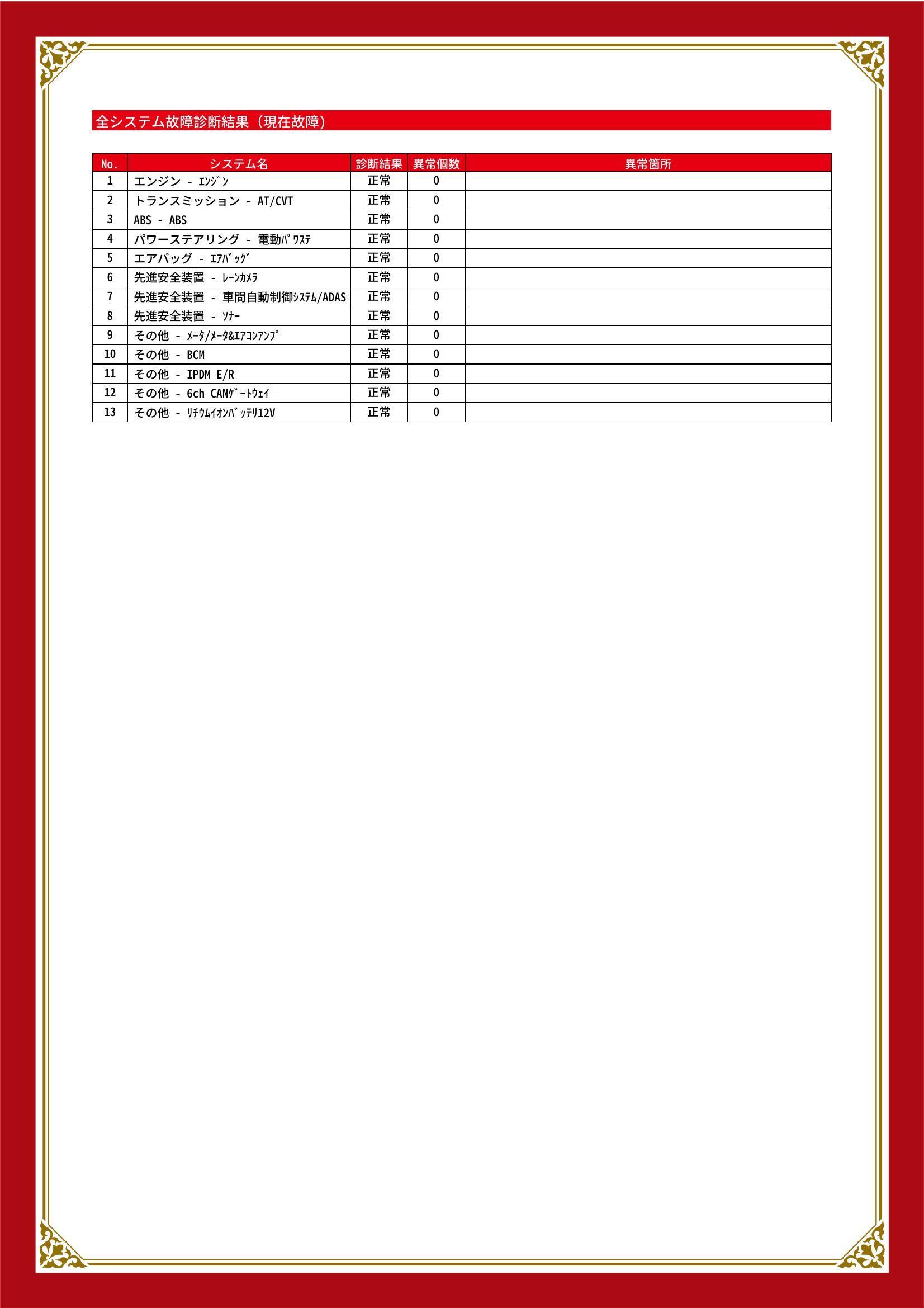 | 保証項目 | 3ヶ月・3000km以内ならエンジン、トランスミッション、ハイブリッド、ステアリング、ブレーキの各機構における主要項目を無償修理(または交換)いたします。 |
