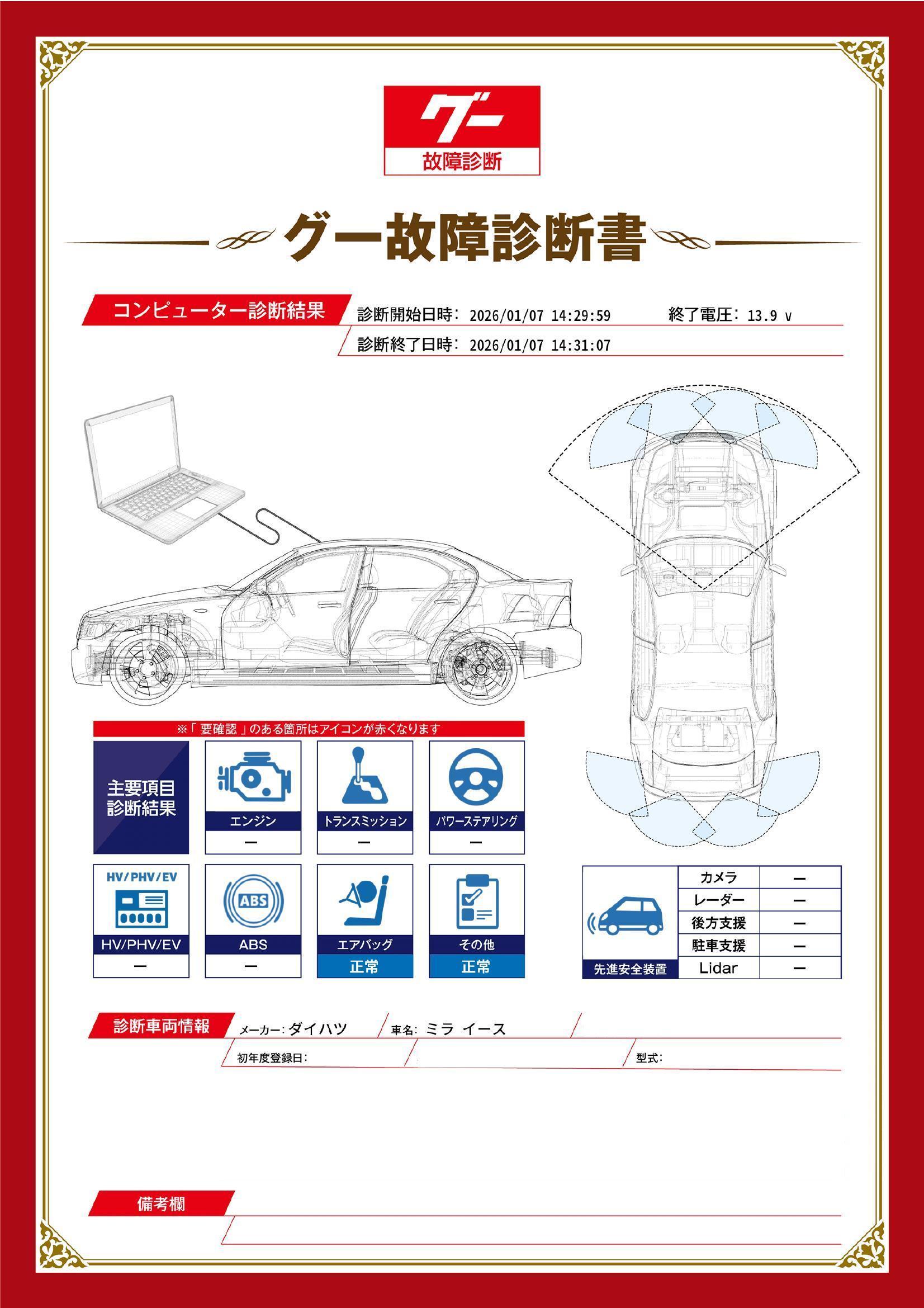 | 保証項目 | 3ヶ月・3000km以内ならエンジン、トランスミッション、ハイブリッド、ステアリング、ブレーキの各機構における主要項目を無償修理(または交換)いたします。 |