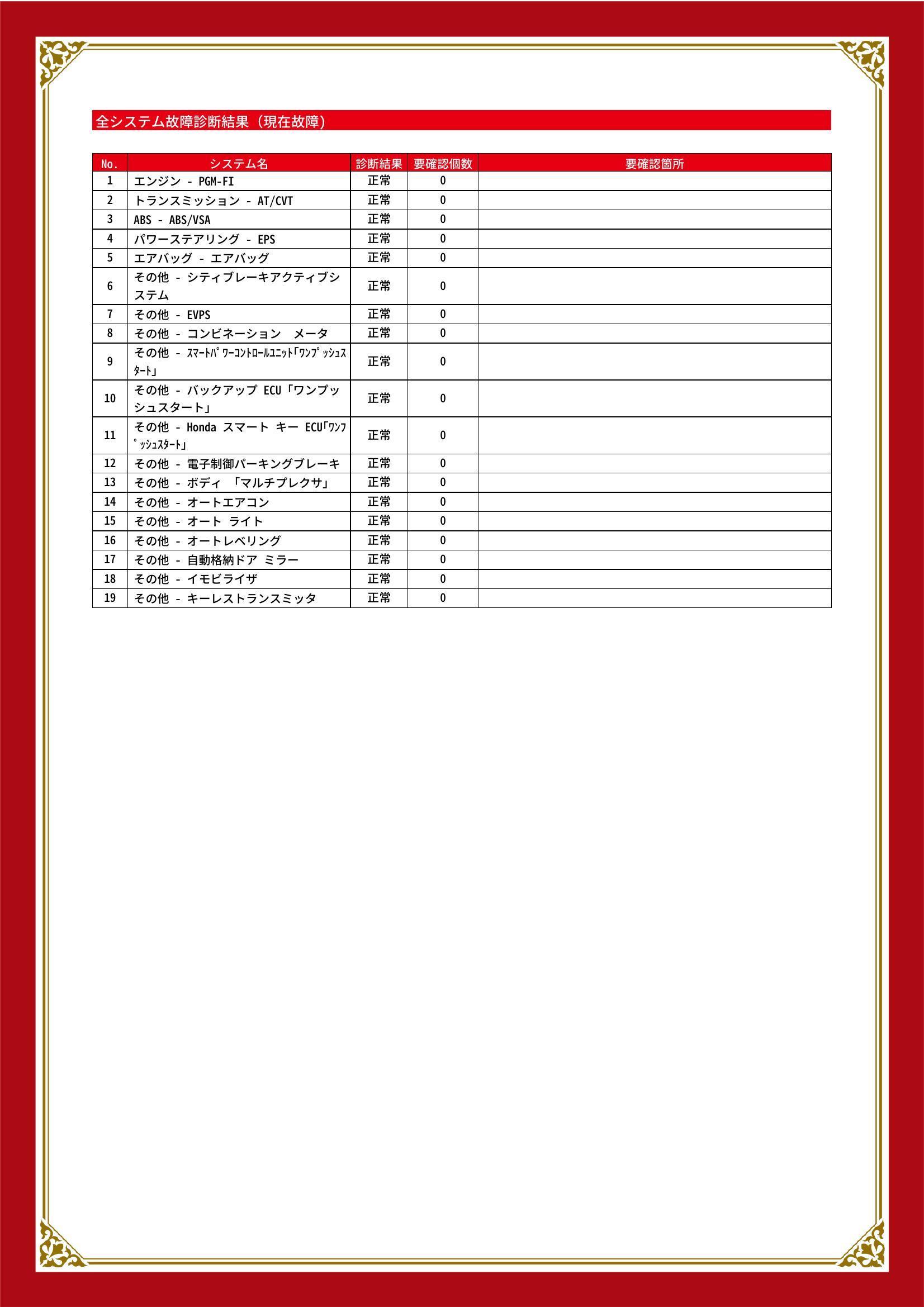 | 保証項目 | 3ヶ月・3000km以内ならエンジン、トランスミッション、ハイブリッド、ステアリング、ブレーキの各機構における主要項目を無償修理(または交換)いたします。 |