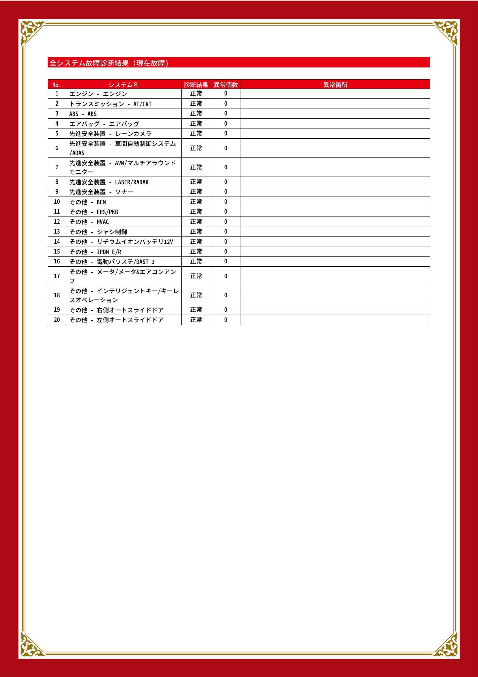 | 保証項目 | 3ヶ月・3000km以内ならエンジン、トランスミッション、ハイブリッド、ステアリング、ブレーキの各機構における主要項目を無償修理(または交換)いたします。 |