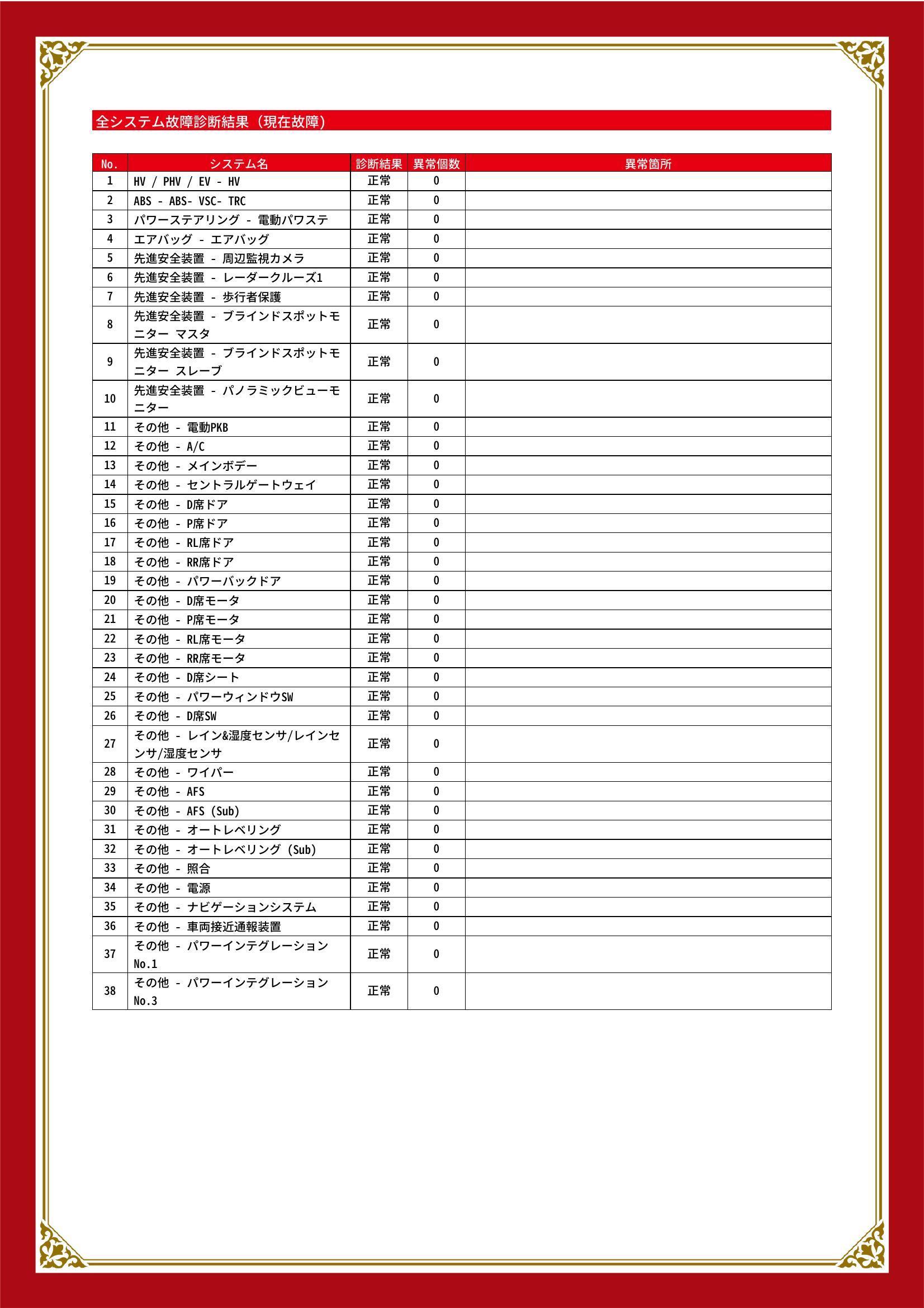 | 保証項目 | 3ヶ月・3000km以内ならエンジン、トランスミッション、ハイブリッド、ステアリング、ブレーキの各機構における主要項目を無償修理(または交換)いたします。 |