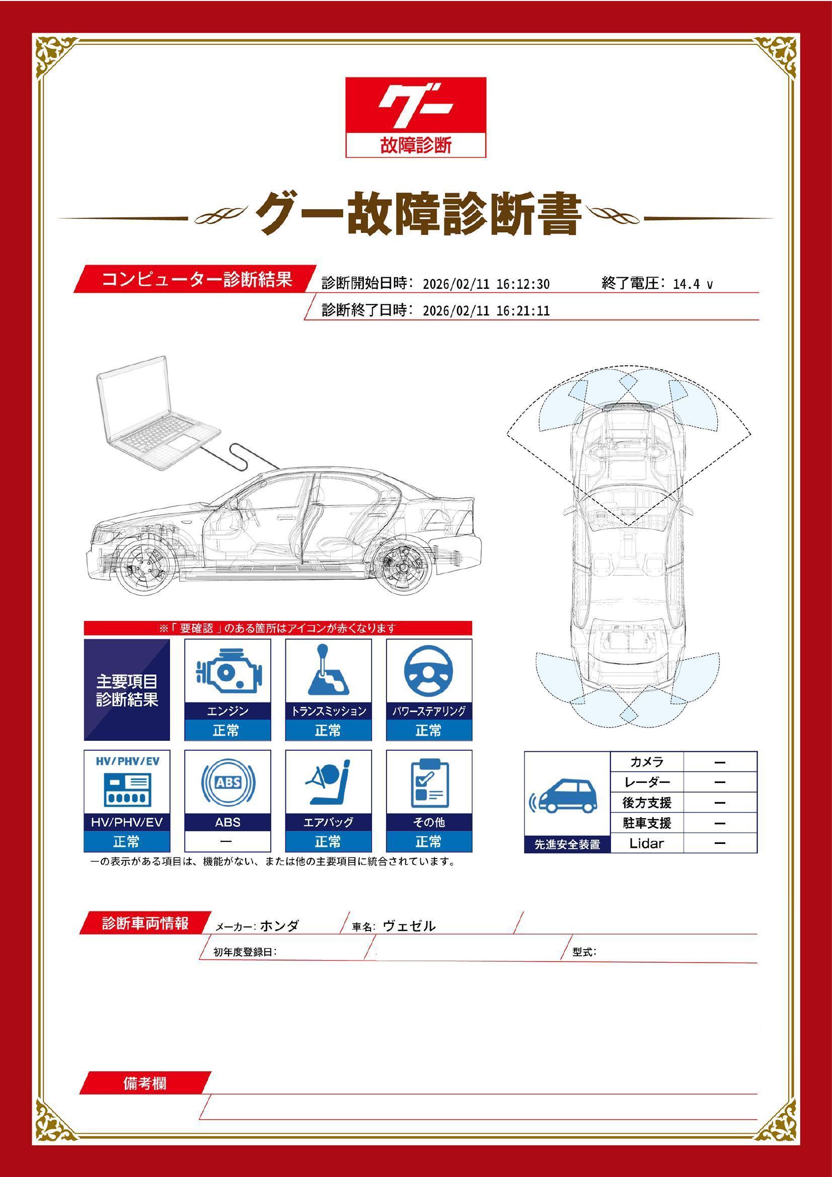 | 保証項目 | 3ヶ月・3000km以内ならエンジン、トランスミッション、ハイブリッド、ステアリング、ブレーキの各機構における主要項目を無償修理(または交換)いたします。 |