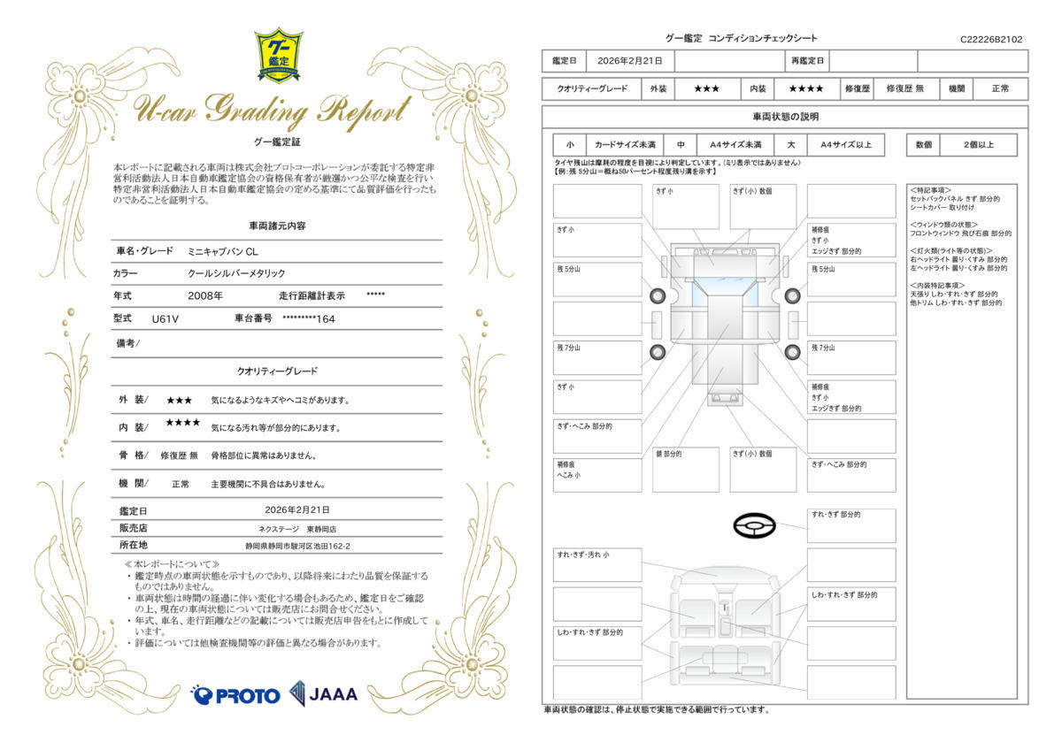 | 保証項目 | 3ヶ月・3000km以内ならエンジン、トランスミッション、ハイブリッド、ステアリング、ブレーキの各機構における主要項目を無償修理(または交換)いたします。 |