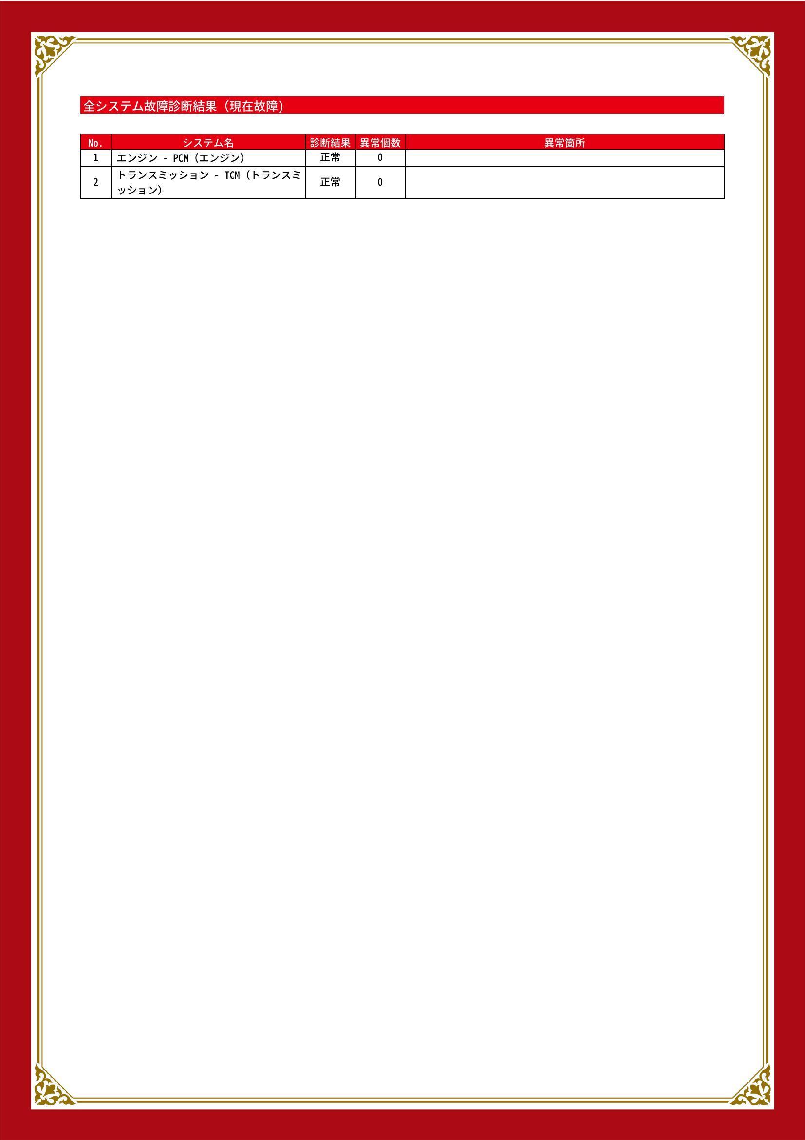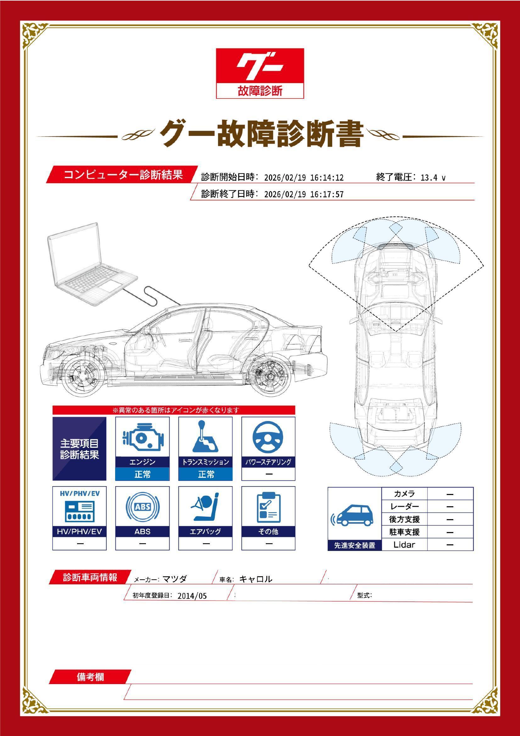 | 保証項目 | 3ヶ月・3000km以内ならエンジン、トランスミッション、ハイブリッド、ステアリング、ブレーキの各機構における主要項目を無償修理(または交換)いたします。 |