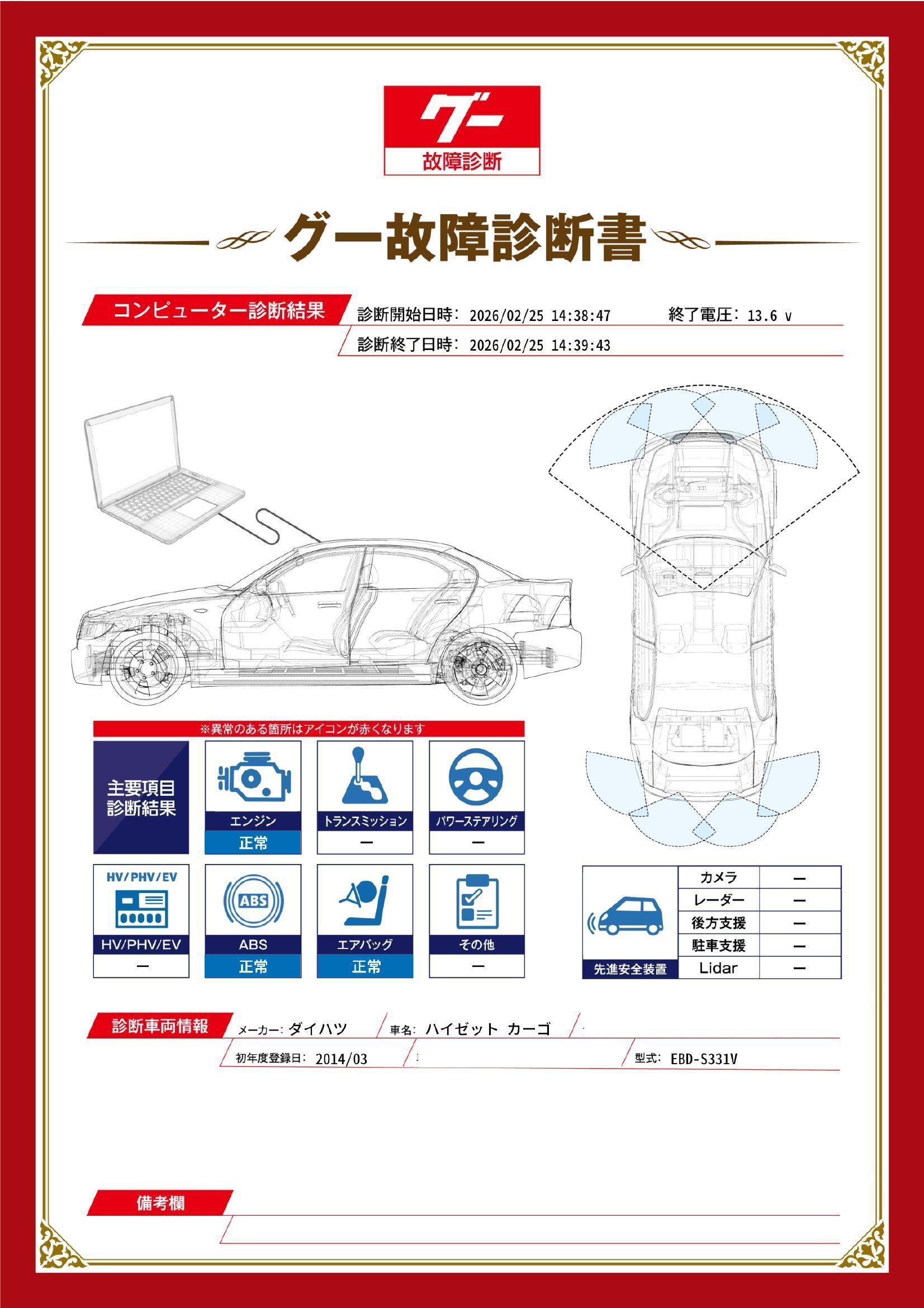 | 保証項目 | 3ヶ月・3000km以内ならエンジン、トランスミッション、ハイブリッド、ステアリング、ブレーキの各機構における主要項目を無償修理(または交換)いたします。 |