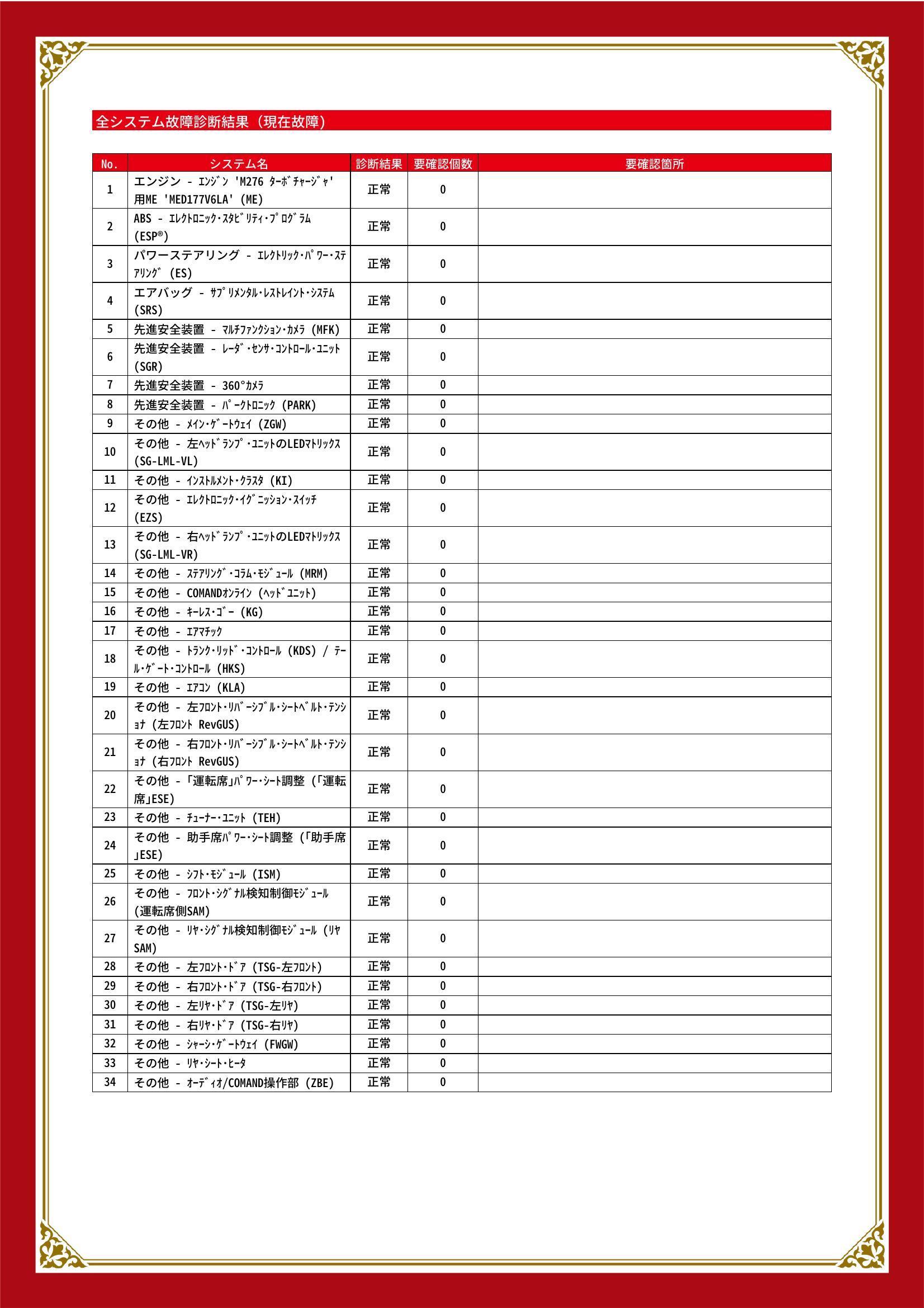 | 保証項目 | ■消耗品、油脂類、外装は保証対象外 全ての消耗部品の補充、交換に要する費用(例:ベルト類、ブレーキディスク・パッド、電球の交換等)は保証修理に含まれません |