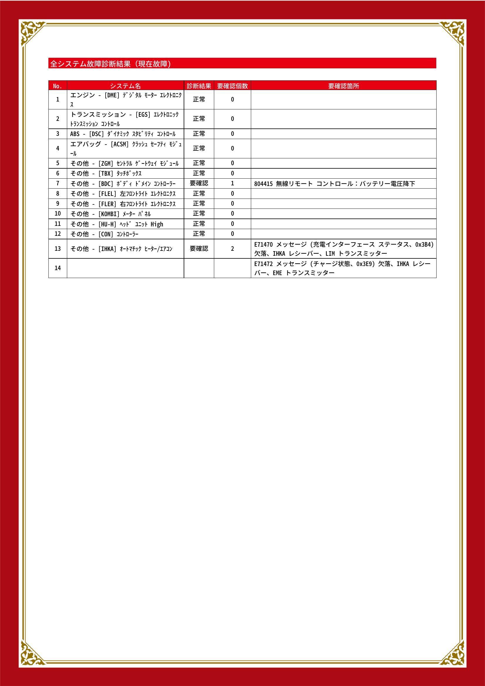 | 保証項目 | ■消耗品、油脂類、外装は保証対象外 全ての消耗部品の補充、交換に要する費用(例:ベルト類、ブレーキディスク・パッド、電球の交換等)は保証修理に含まれません |