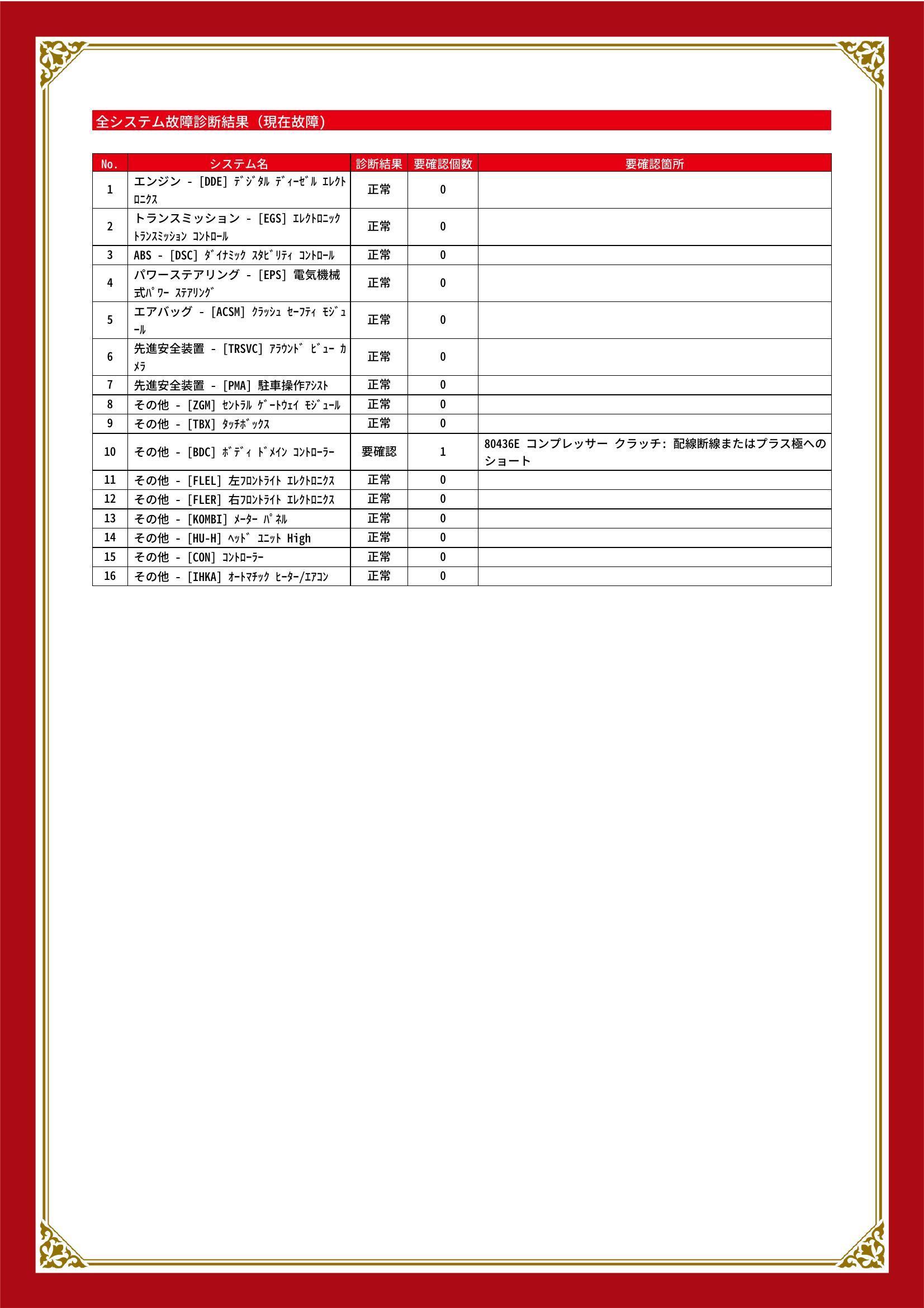 | 保証項目 | ■消耗品、油脂類、外装は保証対象外 全ての消耗部品の補充、交換に要する費用(例:ベルト類、ブレーキディスク・パッド、電球の交換等)は保証修理に含まれません |