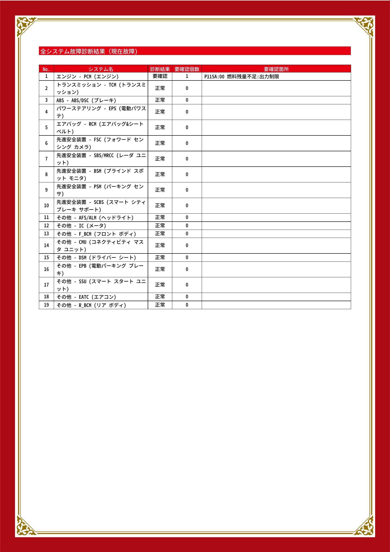| 保証項目 | その他、スタンダード・プラチナ保証をご用意。【スタンダード・プラチナ保証】では対象項目が業界最高水準の400部位以上!消耗品以外は保証にてご対応出来ます。詳細は店舗へお問い合わせください! |