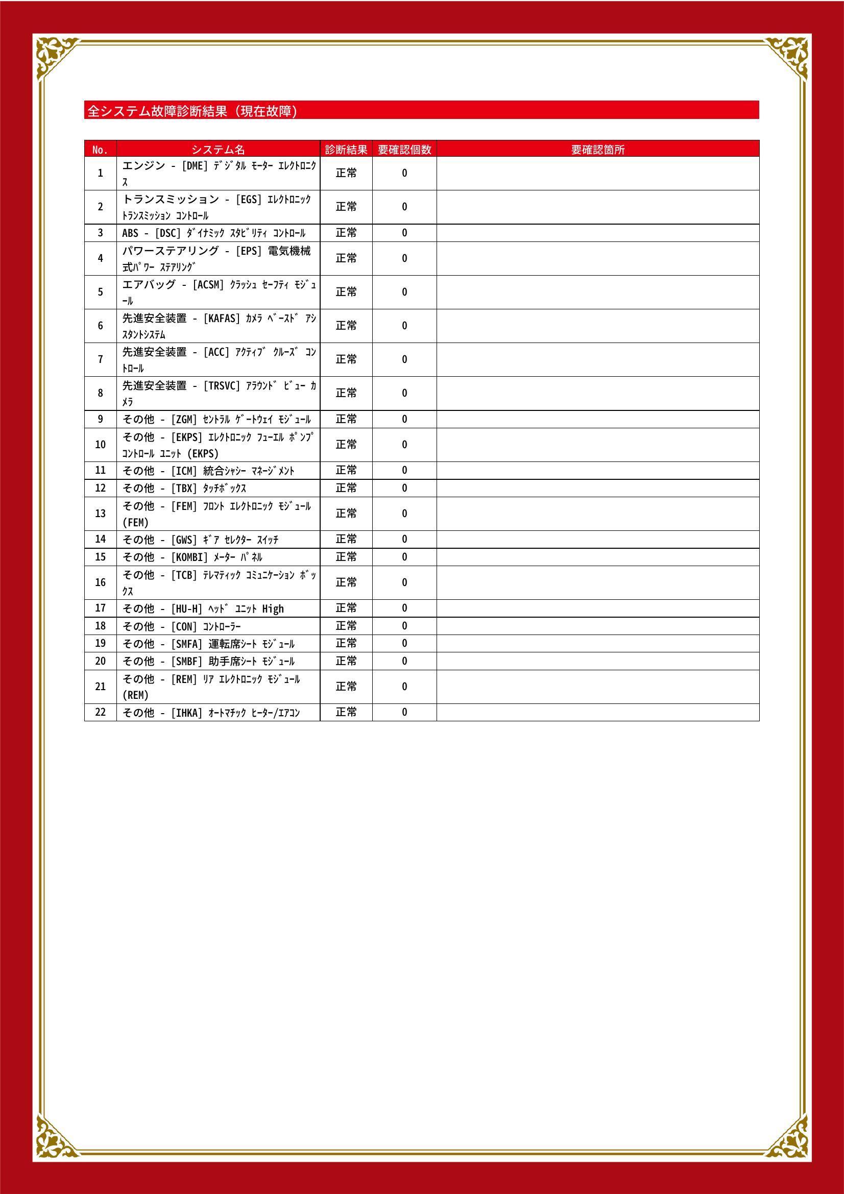 | 保証項目 | ■消耗品、油脂類、外装は保証対象外 全ての消耗部品の補充、交換に要する費用(例:ベルト類、ブレーキディスク・パッド、電球の交換等)は保証修理に含まれません |