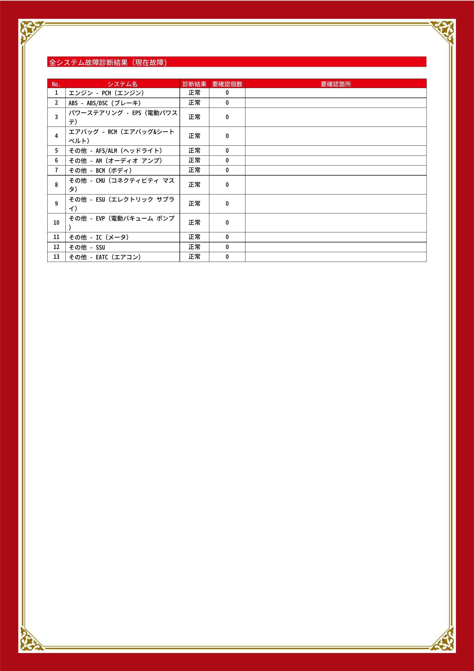 | 保証項目 | その他、スタンダード・プラチナ保証をご用意。【スタンダード・プラチナ保証】では対象項目が業界最高水準の400部位以上!消耗品以外は保証にてご対応出来ます。詳細は店舗へお問い合わせください! |