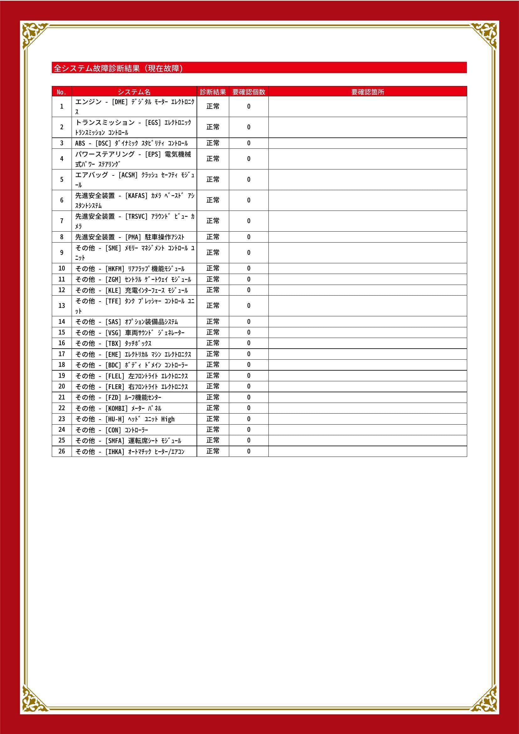 | 保証項目 | ■消耗品、油脂類、外装は保証対象外 全ての消耗部品の補充、交換に要する費用(例:ベルト類、ブレーキディスク・パッド、電球の交換等)は保証修理に含まれません |