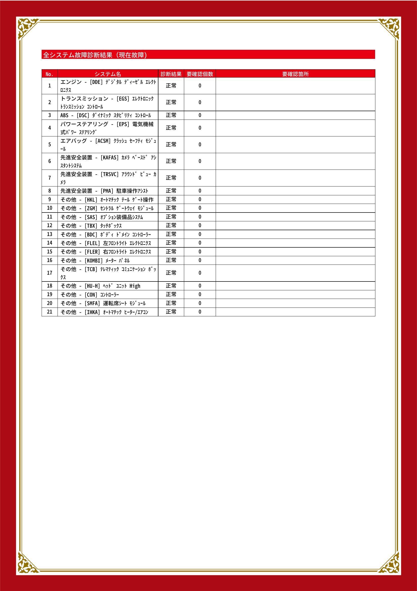 | 保証項目 | ■消耗品、油脂類、外装は保証対象外 全ての消耗部品の補充、交換に要する費用(例:ベルト類、ブレーキディスク・パッド、電球の交換等)は保証修理に含まれません |
