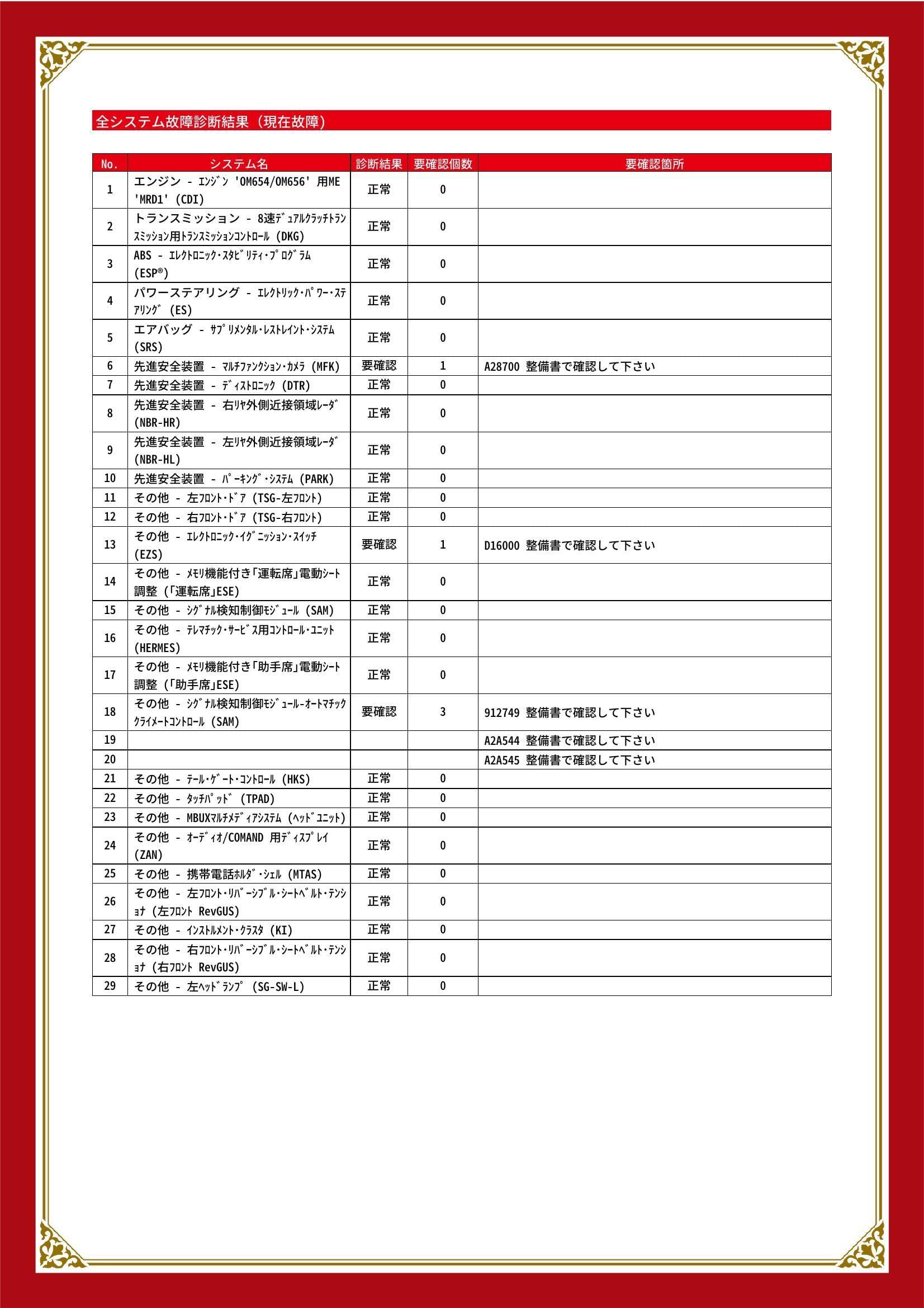 | 保証項目 | ■消耗品、油脂類、外装は保証対象外 全ての消耗部品の補充、交換に要する費用(例:ベルト類、ブレーキディスク・パッド、電球の交換等)は保証修理に含まれません |