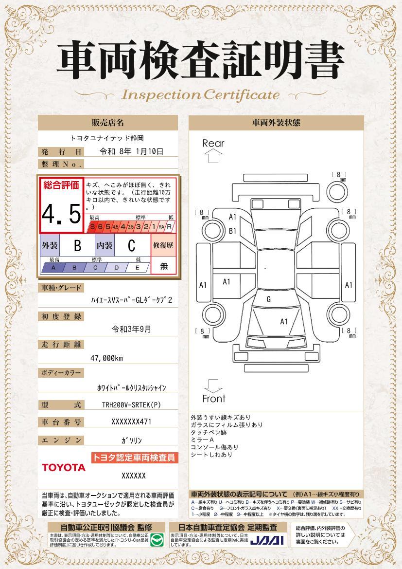 | 保証修理受付先 | 当店に事前にご連絡を下さい。全国約5,000ヶ所で保証修理が可能です。万が一、お出掛け先でのトラブルでも全国のトヨタのテクノショップで保証修理が受けられるオールトヨタのU−Carネットワーク保証です。 |