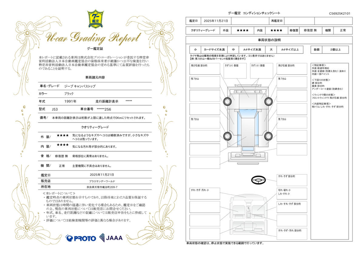 第三者機関によるGOO鑑定にてチェックを入れた上、自社でも修復歴の有無の確認、テスト走行による確認、室内の電装品の動作の確認、そして分解点検整備による機関のチェックと消耗品の交換を徹底しております。又、3ヶ月又は5000kmの無料修理保証(全国販売車に対応)にて対応しております
