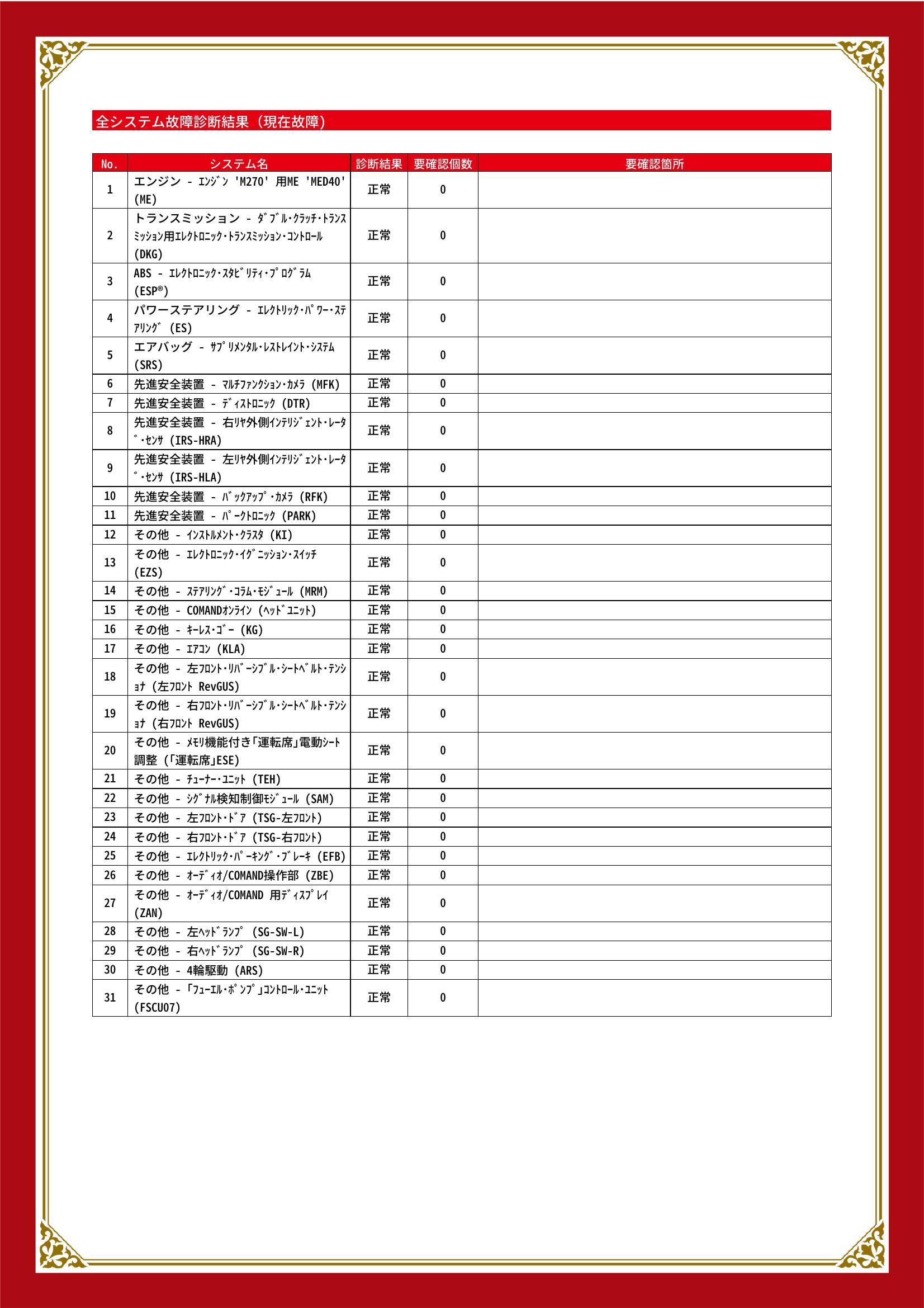 計238項目 有償にて保証期間の長い1年間のEGSスタンダード保証(137項目)、充実内容のEGSプレミアム保証(238項目)もご選択頂けます。遠方のお客様も充実な保証内容で安心安全なカーライフをお楽しみ頂けます。 |