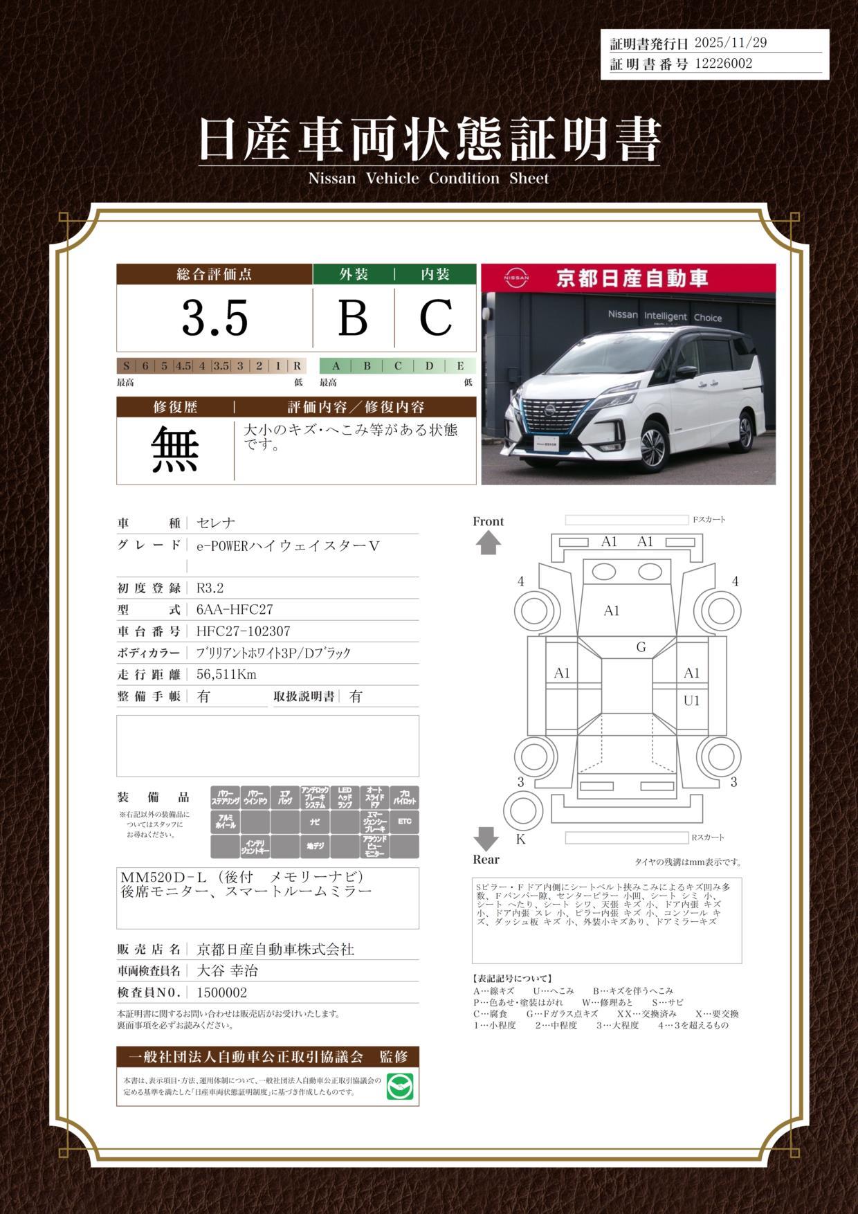 | 保証修理受付先 | 京都日産のご購入店舗にご連絡下さい。全国の日産サービス工場でご利用頂けるので、万が一お出かけ先でトラブルが発生しても安心です。ご納車後、当社にて1ヶ月または1,000km点検が無料で受けられます。 |