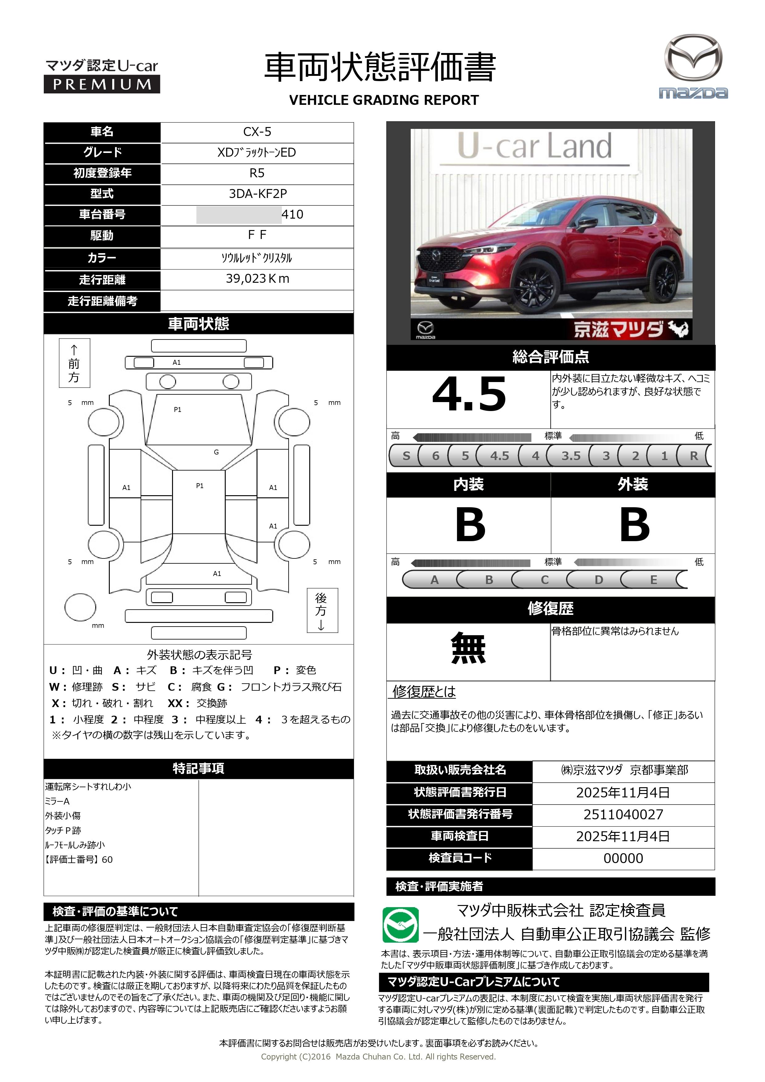 [保証付]:24ヶ月・走行無制限 全国マツダディーラーにて保証対応! ボディの外装部品、内装部品、消耗品、油脂類を除く部品が対象となります。保証期間は2年間で期間中の走行距離は無制限です。また別途有料で延長保証も、ご用意しております。 |