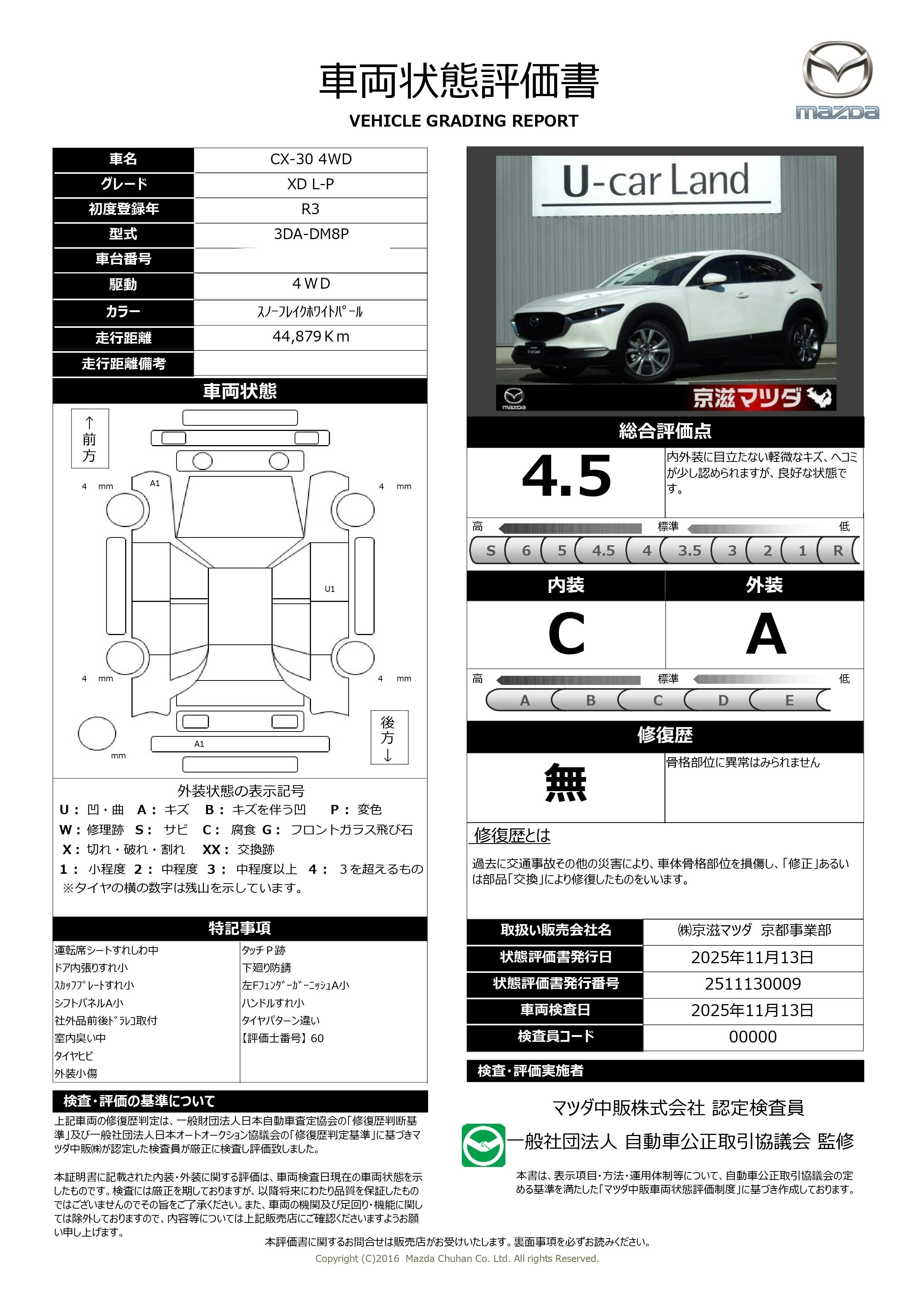 | 保証修理受付先 | 先ずは当店にご連絡ください。全国約800か所のマツダサービス工場で保証修理が可能ですので、旅先やお引越し先でのトラブルもご安心下さい。※マツダブランド車以外は当社のみ対応可能。詳しくはスタッフまで。 |