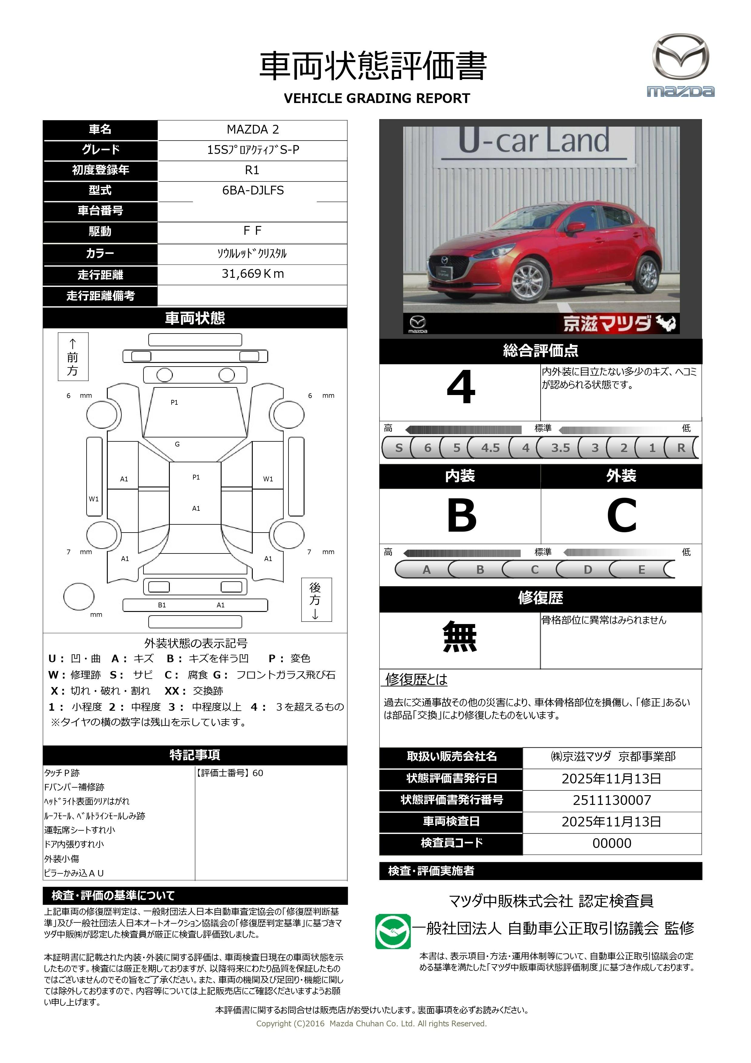 | 保証修理受付先 | 先ずは当店にご連絡ください。全国約800か所のマツダサービス工場で保証修理が可能ですので、旅先やお引越し先でのトラブルもご安心下さい。※マツダブランド車以外は当社のみ対応可能。詳しくはスタッフまで。 |