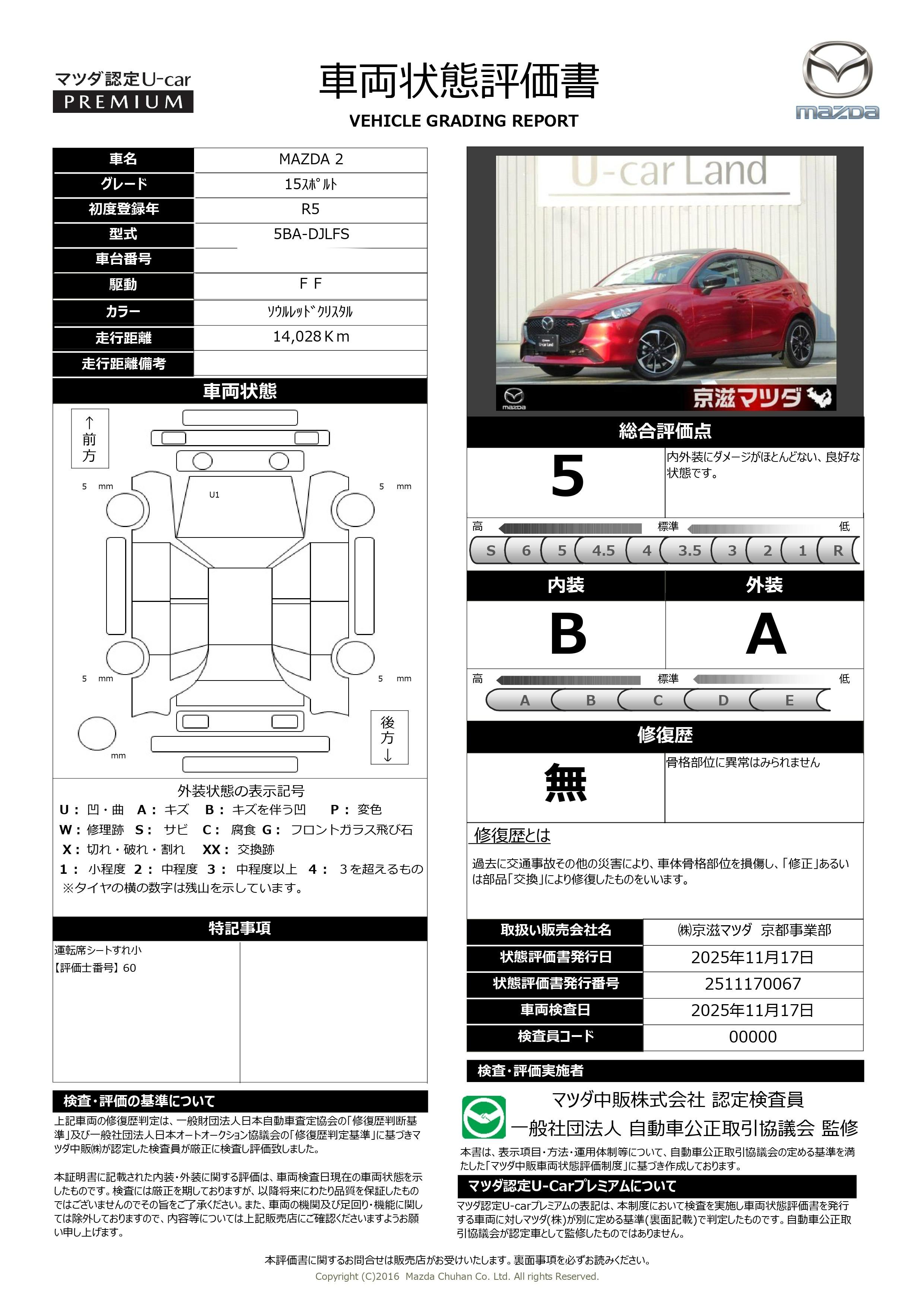 [保証付]:24ヶ月・走行無制限 マツダの店舗にてご購入頂いたお車に、無料でご提供している納車日より1年間・走行無制限の{さわやか保証}が付いております。別途有償で{さわやかプラス}にご加入頂くと、最大3年間の保証サービスが可能です。 |