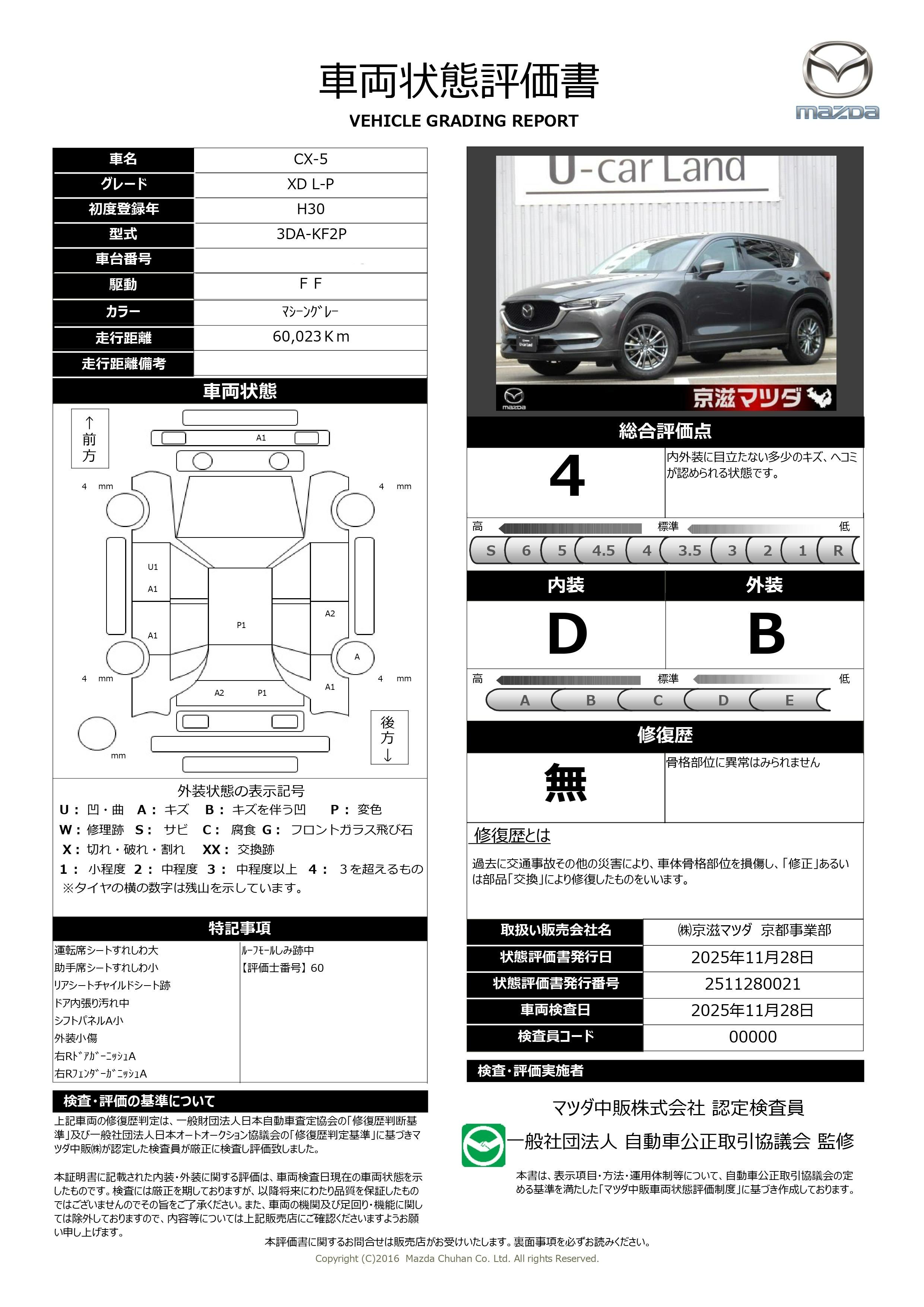 | 保証修理受付先 | 先ずは当店にご連絡ください。全国約800か所のマツダサービス工場で保証修理が可能ですので、旅先やお引越し先でのトラブルもご安心下さい。※マツダブランド車以外は当社のみ対応可能。詳しくはスタッフまで。 |