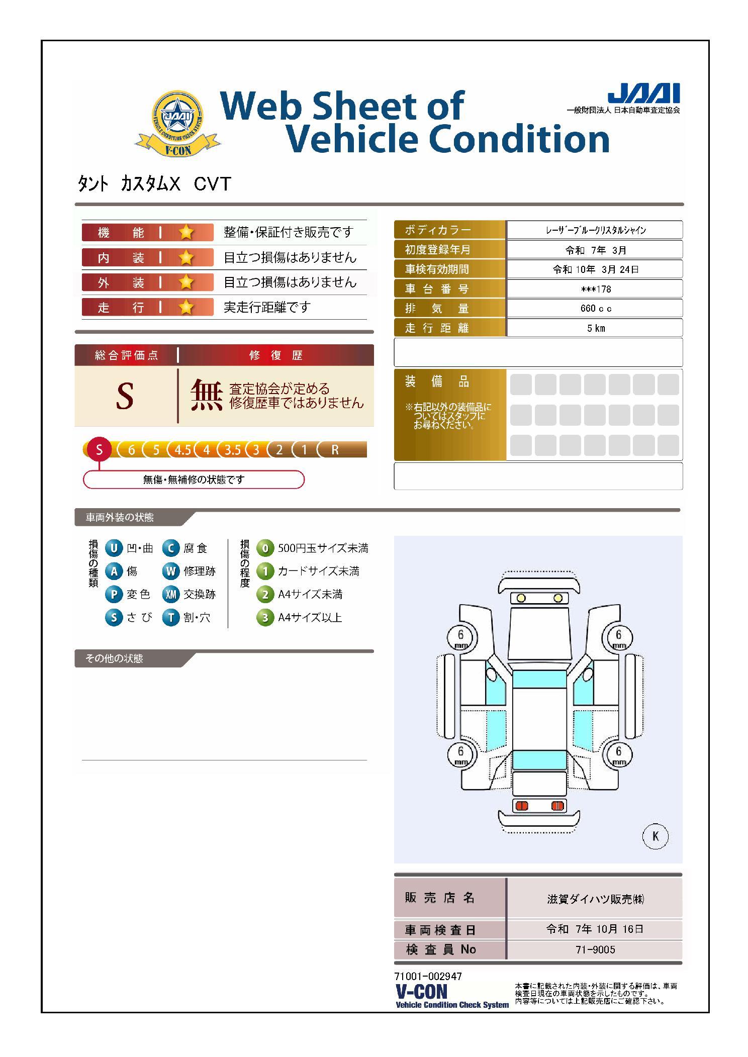| 保証項目 | 新車メーカー保証に準じた保証(エンジン・エアコン・トランスミッション他)を1年間(走行距離無制限)無償で受けられます。 |