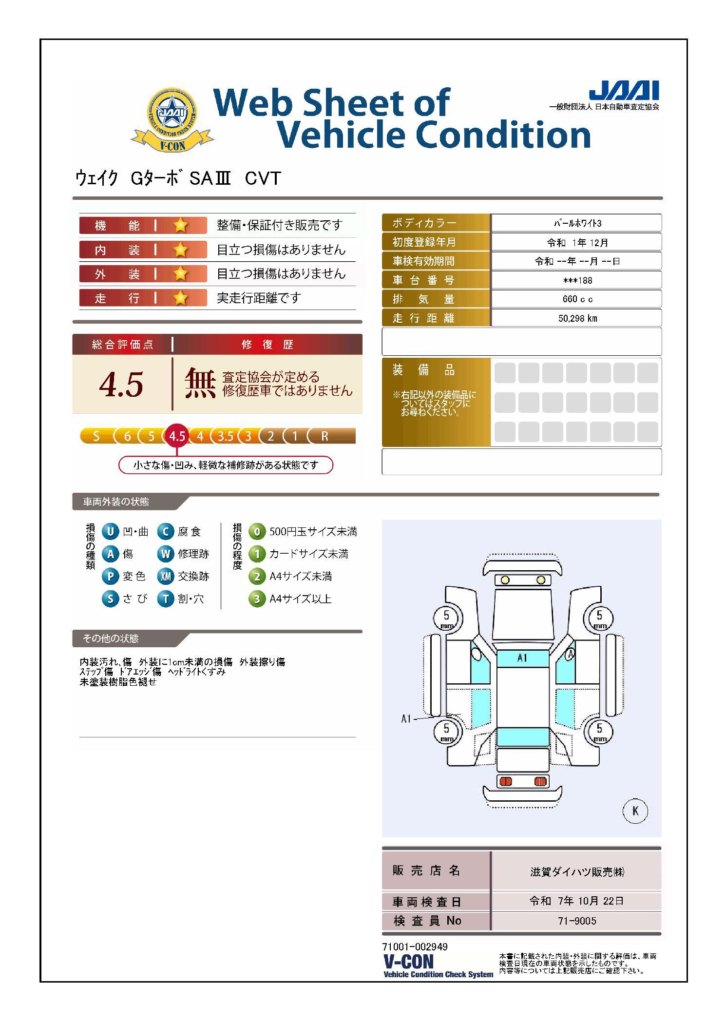 | 保証項目 | 新車メーカー保証に準じた保証(エンジン・エアコン・トランスミッション他)を1年間(走行距離無制限)無償で受けられます。 |