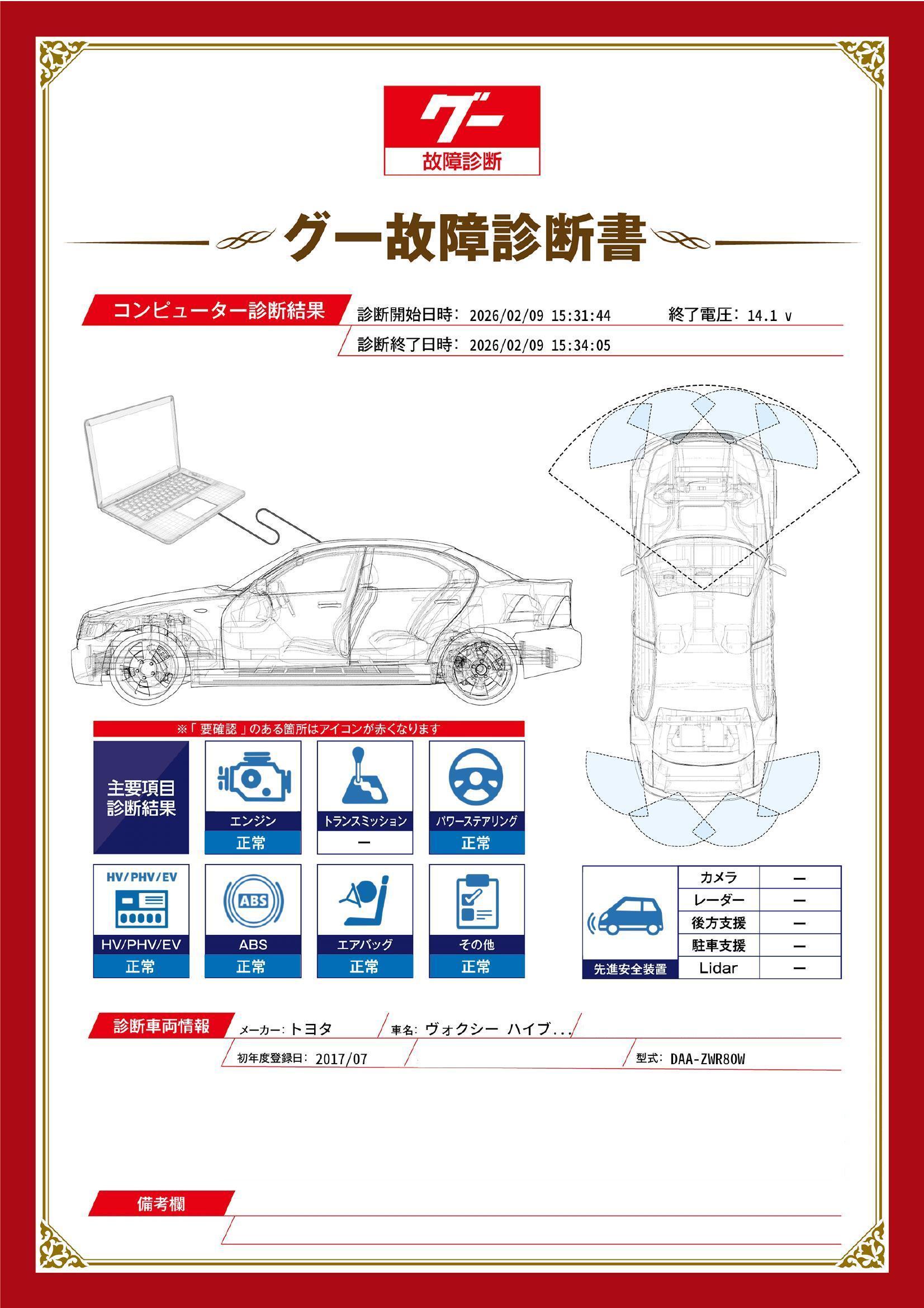 | 保証項目 | 3ヶ月・3000km以内ならエンジン、トランスミッション、ハイブリッド、ステアリング、ブレーキの各機構における主要項目を無償修理(または交換)いたします。 |