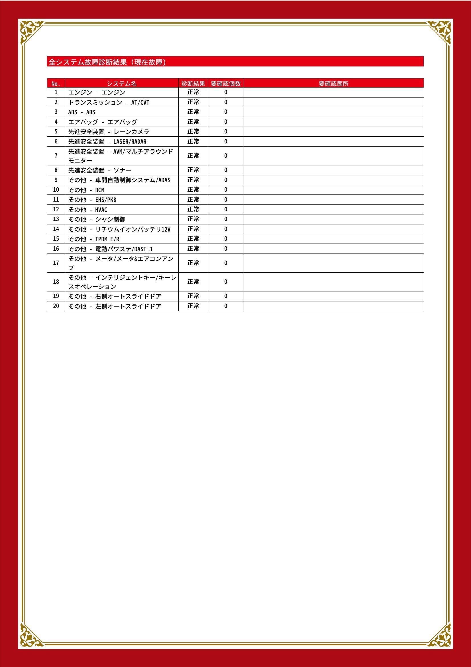 | 保証項目 | 3ヶ月・3000km以内ならエンジン、トランスミッション、ハイブリッド、ステアリング、ブレーキの各機構における主要項目を無償修理(または交換)いたします。 |