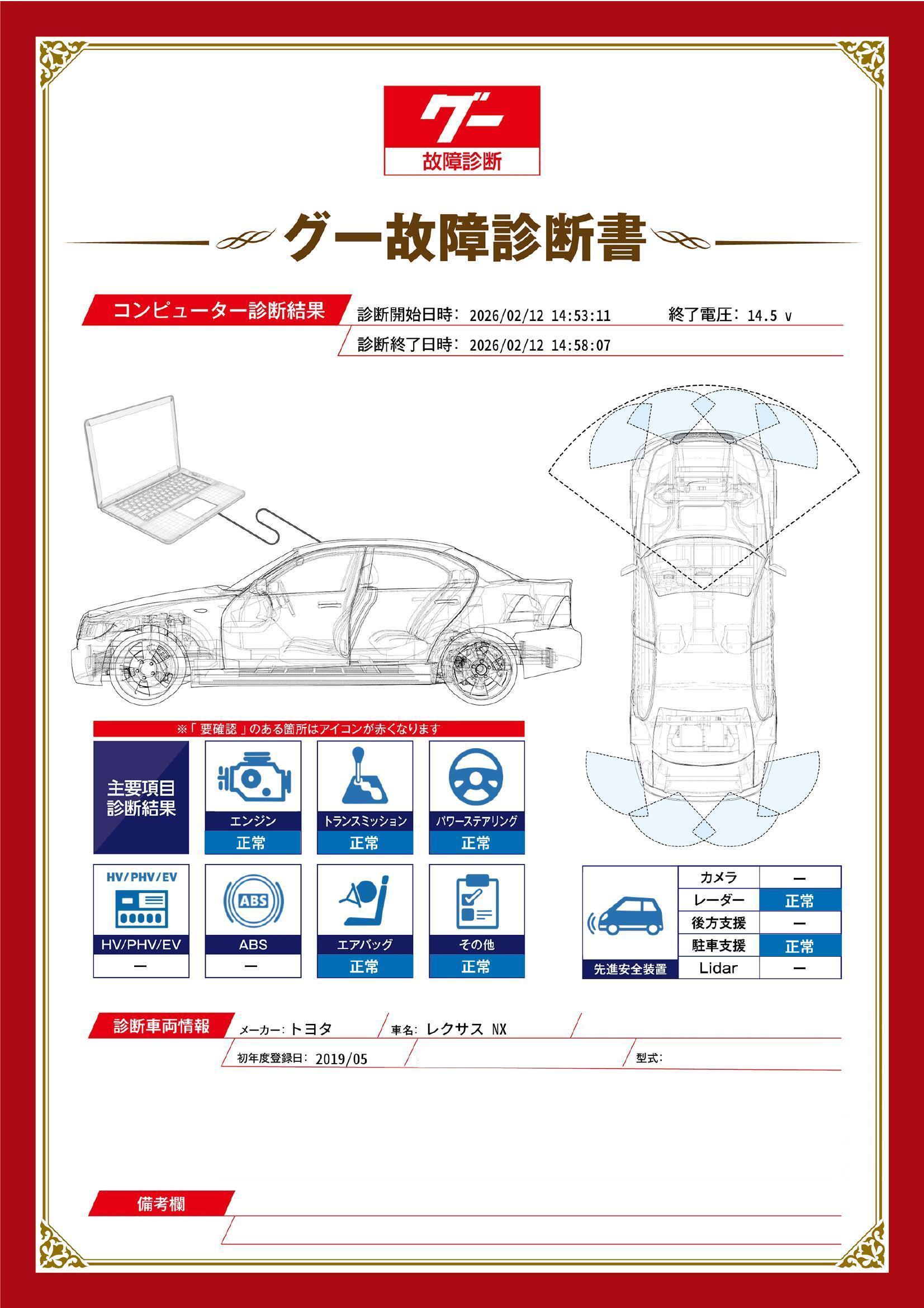 | 保証項目 | 3ヶ月・3000km以内ならエンジン、トランスミッション、ハイブリッド、ステアリング、ブレーキの各機構における主要項目を無償修理(または交換)いたします。 |