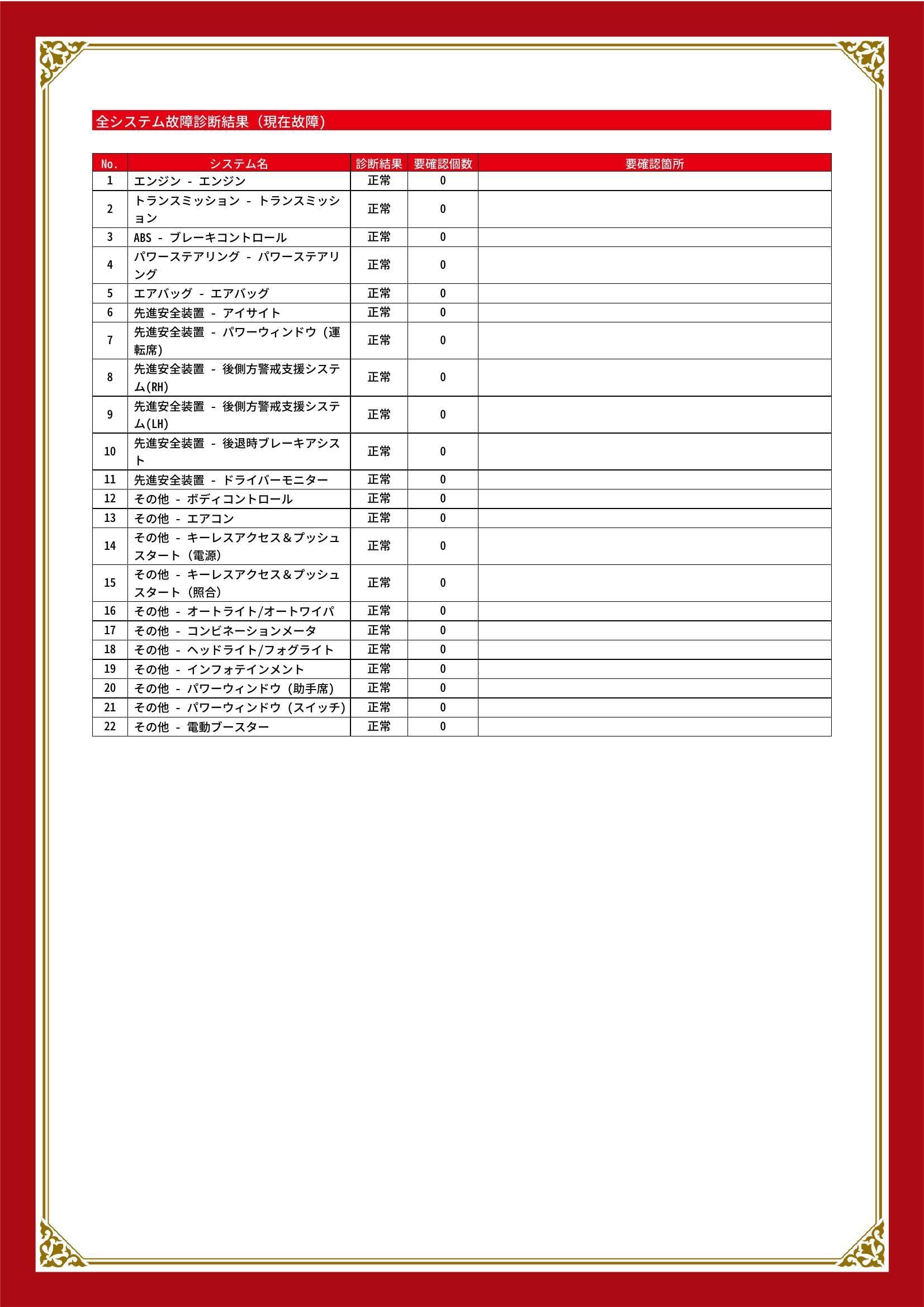 | 保証項目 | 3ヶ月・3000km以内ならエンジン、トランスミッション、ハイブリッド、ステアリング、ブレーキの各機構における主要項目を無償修理(または交換)いたします。 |