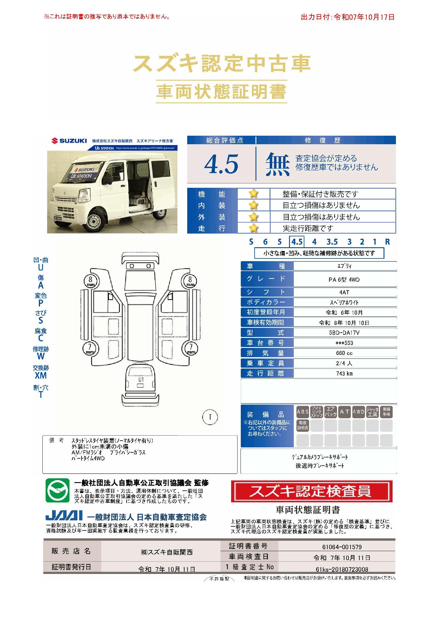 スズキ エブリイ PA 6型 パートタイム4WD 4AT プレミアム中古車 4WD 後席両側スライドドア AM/FMラジオ 衝突被害軽減ブレーキ リヤパーキングセンサー フロアマット アイドリングストップ ハイビームアシスト マッドフラップ スペアタイヤ 車線逸脱警報機能