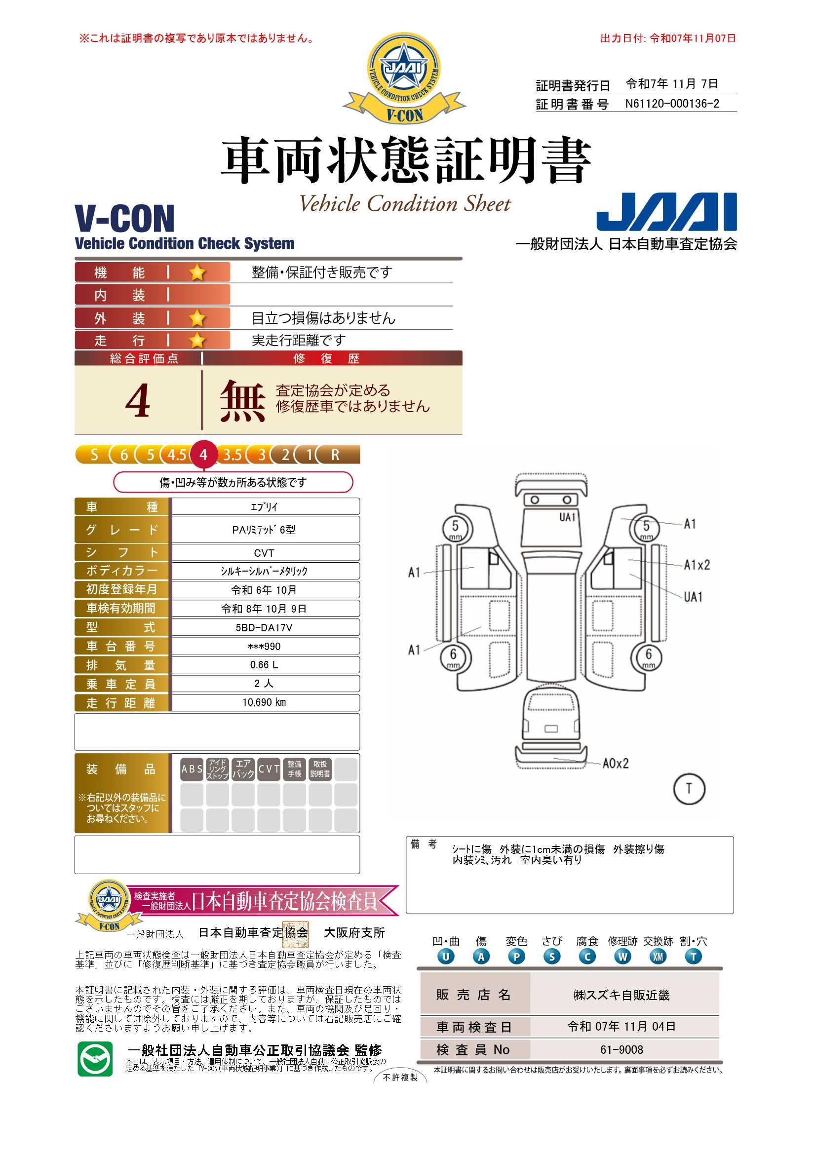 | 保証について | [保証付]:2027(令和9)年10月まで・60000km ※いずれか早い時期が保証適用の条件となります。 |